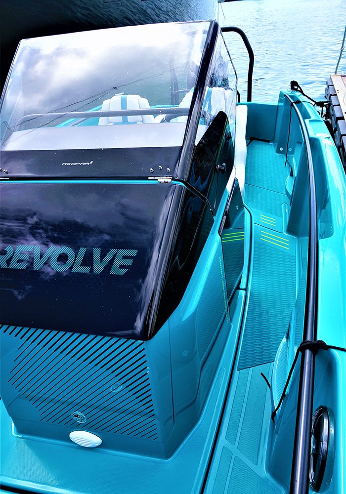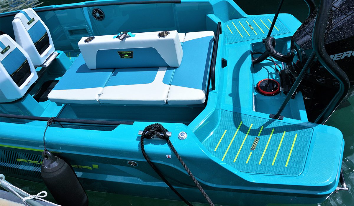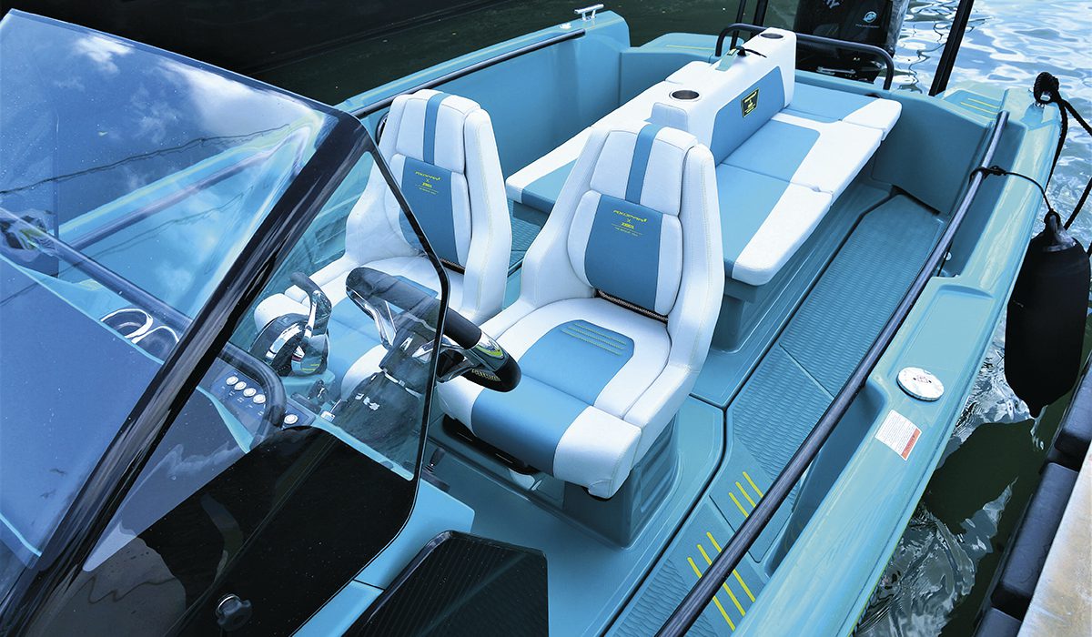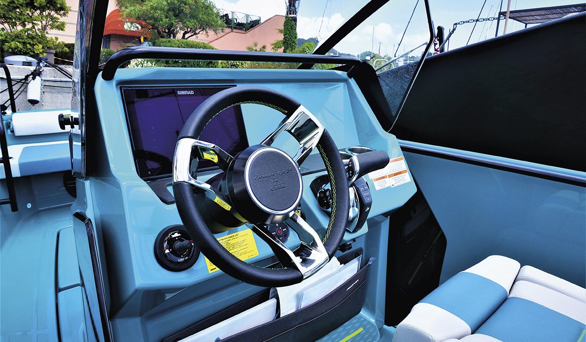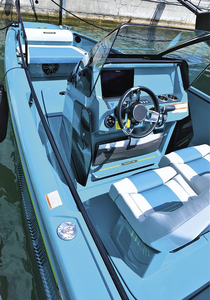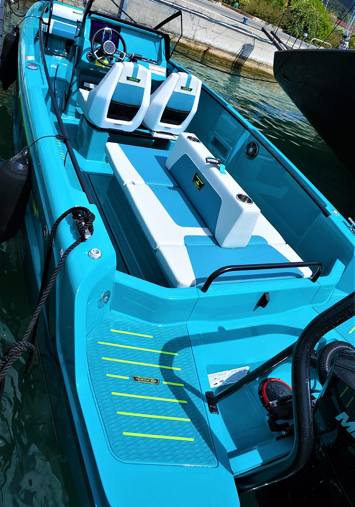 Look trendy e livrea che si fa notare: un gelcoat verde turchese con linee giallo fluo e finiture “sportive”. Funzionale il layout: un walkaround aperto con tanto spazio per circolare a bordo. Comodi i sedili di pilotaggio, ruotabili verso poppa. Consolle con ottima visuale e comandi a portata di mano. Parabrezza a inclinazione regolabile e deflettori laterali ai piedi della consolle completano la pro-tezione. Il portellone sul fronte della consolle, rialzabile, dà accesso alla toeletta con wc e lavabo.