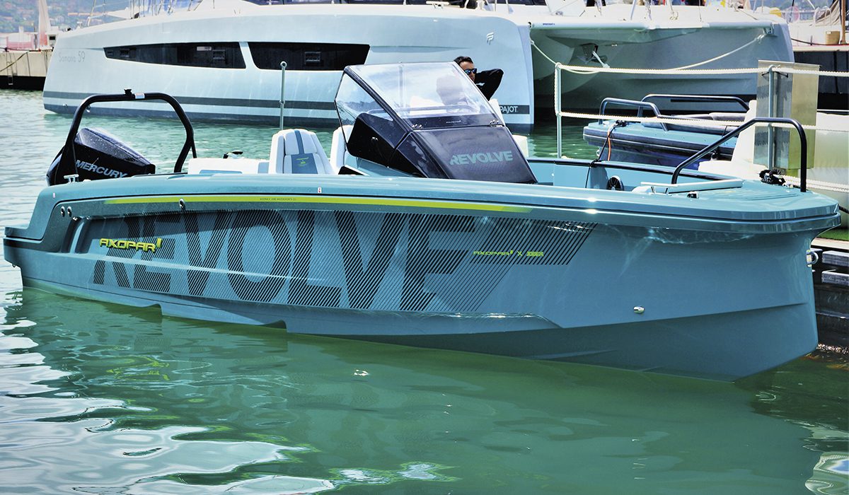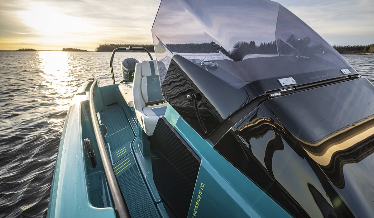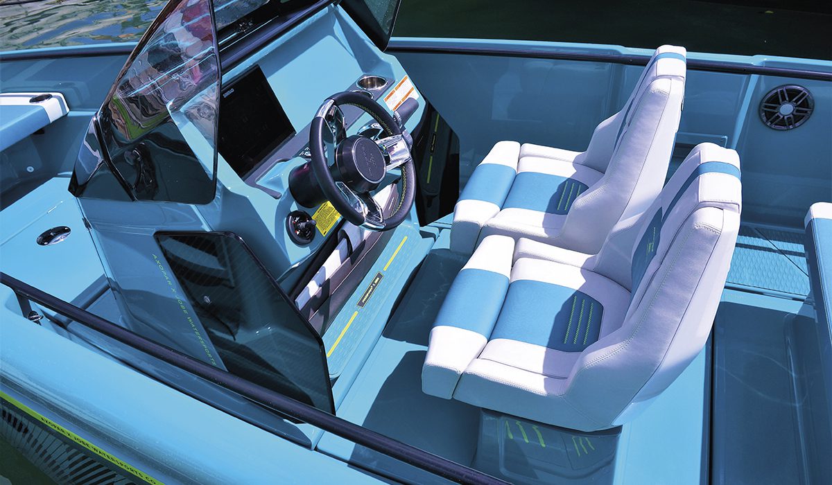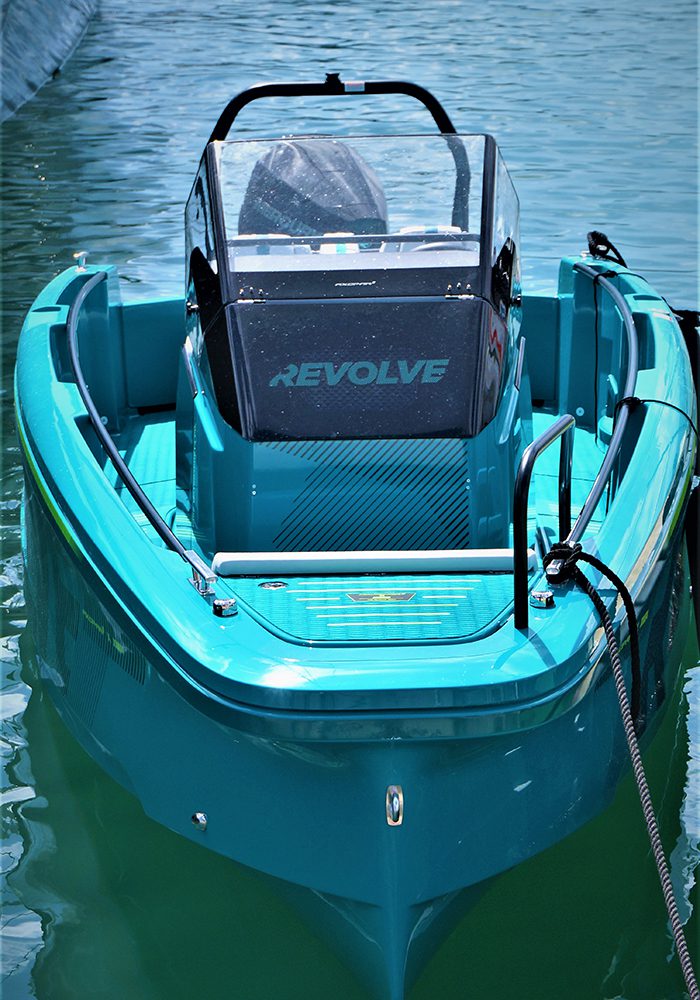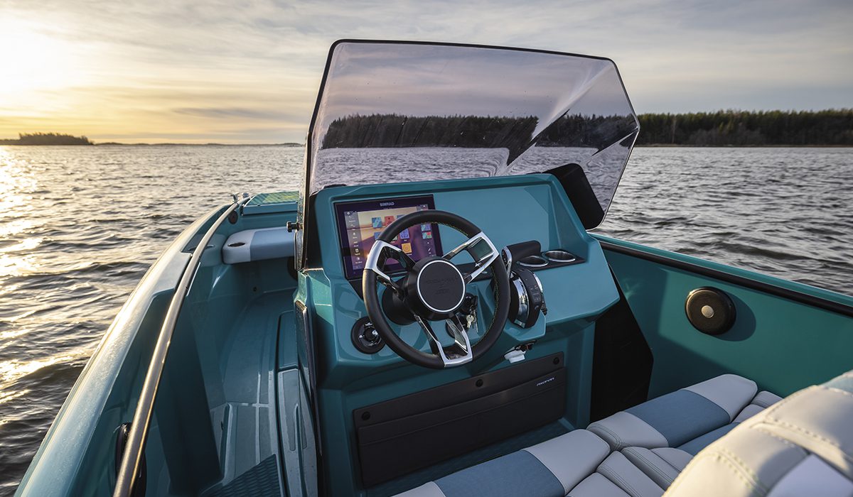 Look trendy e livrea che si fa notare: un gelcoat verde turchese con linee giallo fluo e finiture “sportive”. Funzionale il layout: un walkaround aperto con tanto spazio per circolare a bordo. Comodi i sedili di pilotaggio, ruotabili verso poppa. Consolle con ottima visuale e comandi a portata di mano. Parabrezza a inclinazione regolabile e deflettori laterali ai piedi della consolle completano la pro-tezione. Il portellone sul fronte della consolle, rialzabile, dà accesso alla toeletta con wc e lavabo.