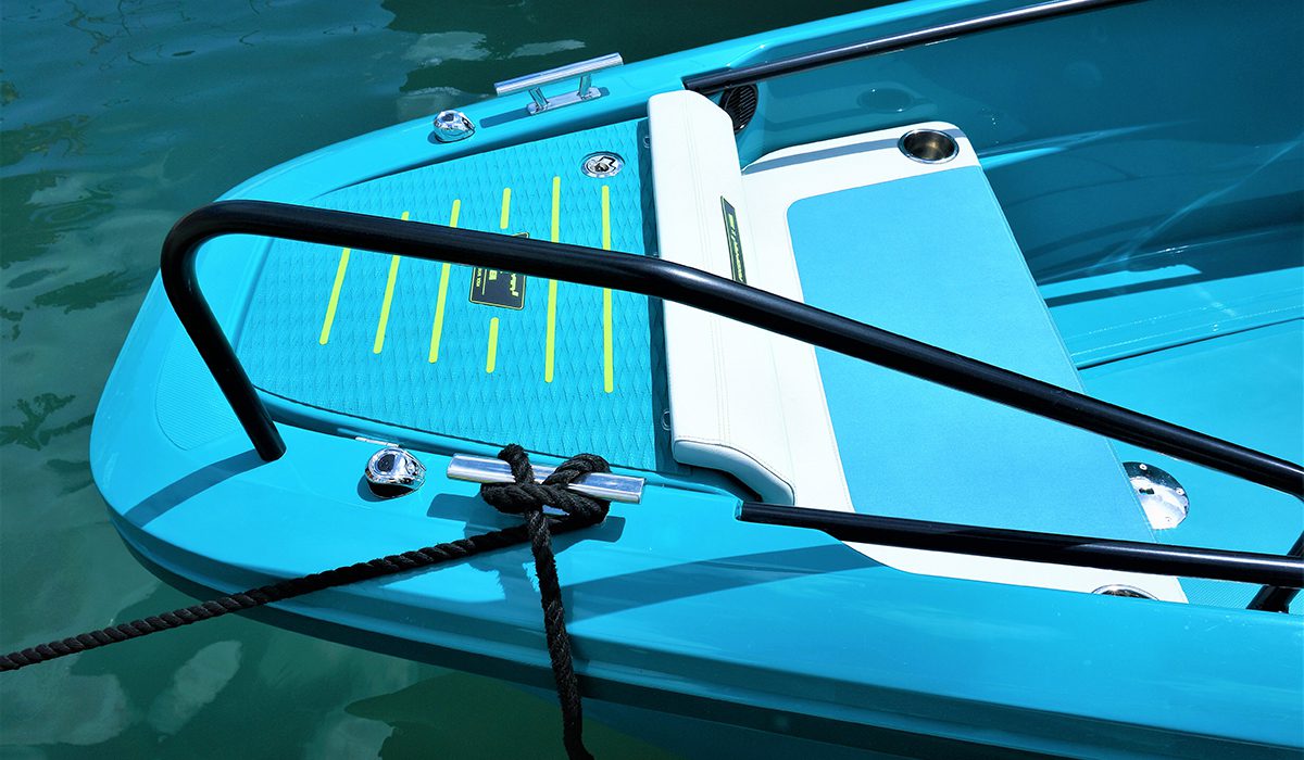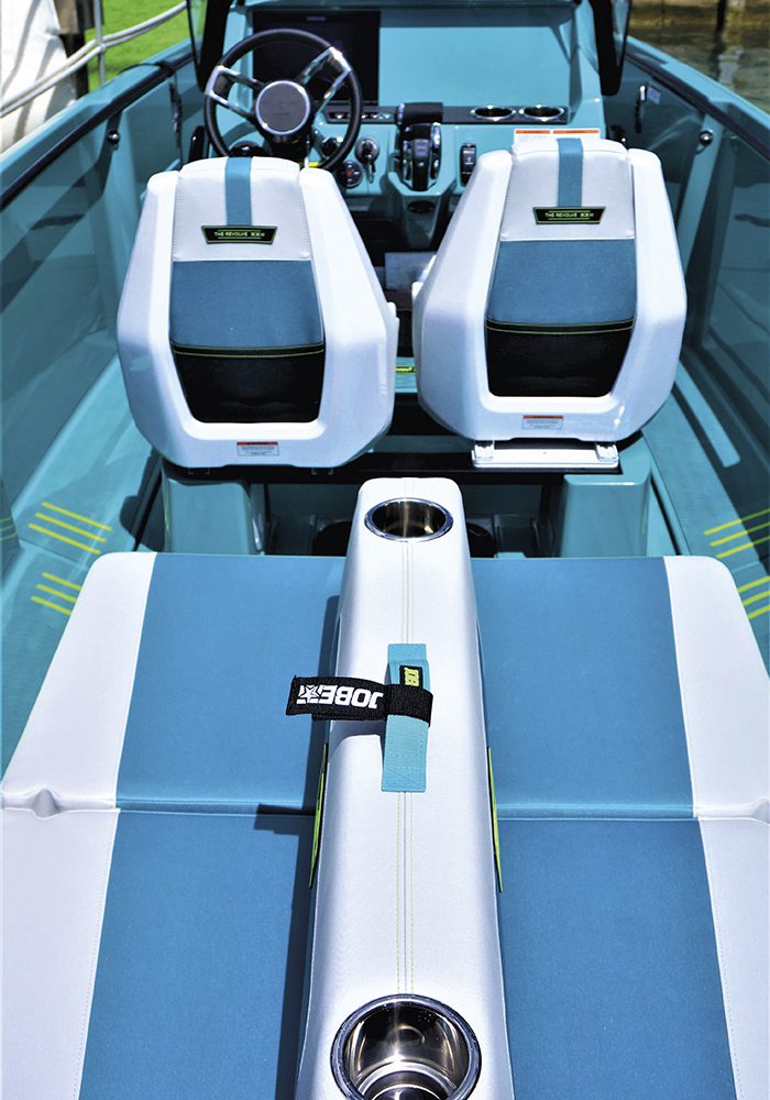 A poppa un modulo centrale con schienale removibile, trasformabile in prendisole, occulta un grande ga-vone che ospita l’attrezzatura JOBE per sport acquatici, sia di serie che opzionale, comprendente anche SUP e Sea-Scooter elettrici. La struttura sopra il motore, tra due plancette laterali, consente il fissaggio della fune di trazione.