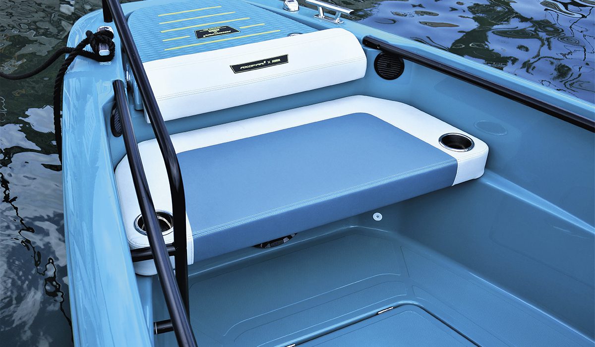 Come i fratelli maggiori 28 e 37, anche questo 22 stupisce: con prua ad inclinazione negativa, affilata e aggressiva, baglio massimo a poppa, baricentro molto basso e scafo con doppio redan, il DNA Axopar è chiaramente presente, confermando il carattere sportivo e moderno. Oltre alla versione base Spyder prevede la serie JOBE, azienda olandese leader negli sport acquatici. E il modello che proviamo è quello di punta, l’Axopar X JOBE “The Revolve XXII”.