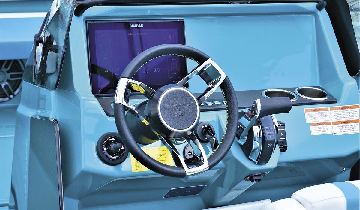 Il Mercury 200hp V6 è molto silenzioso. Durante l’accelerazione la barca sale gradualmente sui redan mentre entra in planata e si assesta su una inclinazione di 10 °- 15°, lo scafo scivola docile a tutti i regimi. Comfort di guida ottimo, timone preciso e barca con straordinaria agilità anche con manovre al limite. Man mano che aumenta la velocità l’effetto dei redan la rende più morbida, anche con moto ondoso. Consumo di carburante lineare e doti di accelerazione eccezionali: da 0 a 44 nodi in meno di 19” ed en-trata in planata in meno di 5”. Il controllo del gas è fluido e dotato dell’opzione di attracco che riduce la potenza del 50{2e3577d2bd6aebaa150c85c33fcd353783f1aa6c690283591e00ef60b3336fc8} per manovre più dolci in porto.