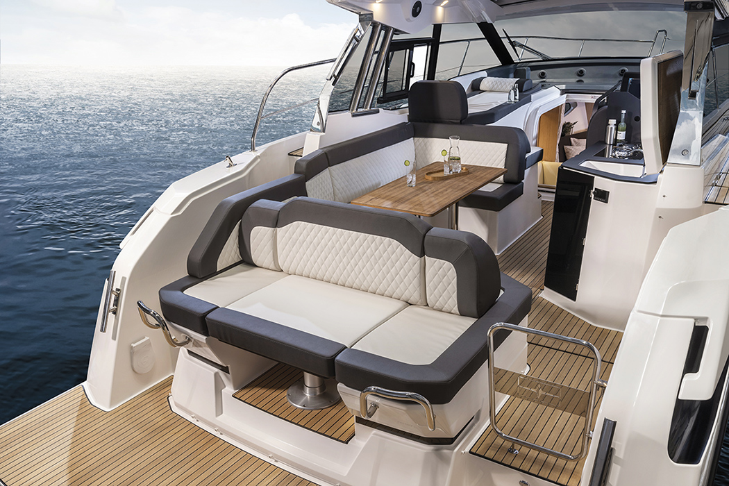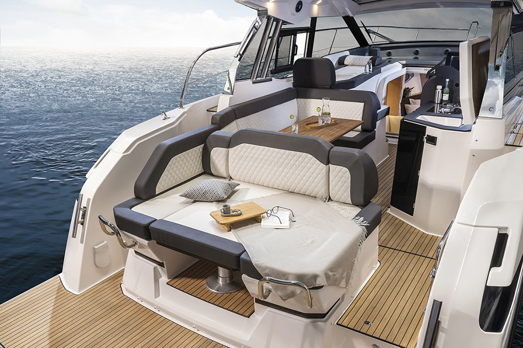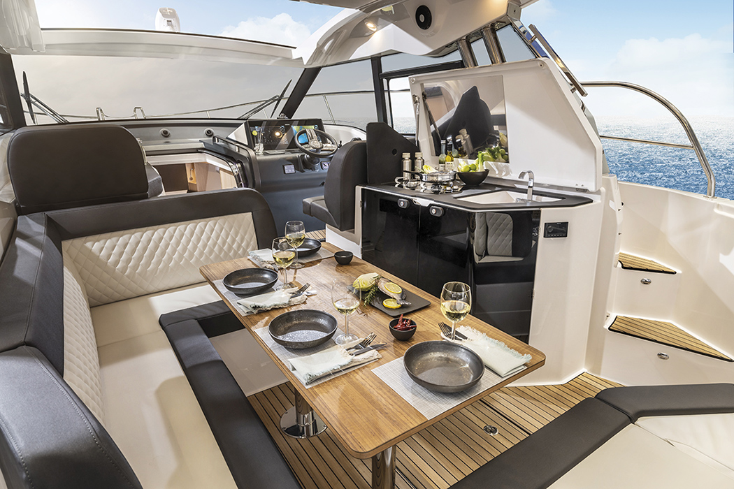 Lo schienale del divano di poppa è tuttavia basculante e, cambiando posizione, può andare a servire la parte centrale del piano prendisole che, sollevandosi, diventa un tavolino trasformando il tutto in una piacevolissima dinette che si affaccia sulla spiaggetta poppiera, ovvero sul mare. Molto ben studiata la plancia di guida, che consente numerose posizioni di adattamento ed è supportata sulla sinistra da una gradevole chaise longue fronte marcia e da una seduta. Il tutto reso particolarmente confortevole da un tettuccio apribile che, quando necessario, apporta aria e luce.