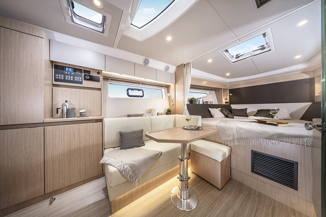 Da questo punto di vista, il lavoro dello studio di Marco Casali (un pizzico di made in Italy fa sempre orgoglio) ha sfruttato al massimo gli spazi puntando su una modularità trasformabile che ha consentito l’ottima gestione degli spazi aperti senza troppo sacrificare il sottocoperta. In altre parole il pozzetto è centrato su una zona conviviale che può fungere da area di relax o da dinette, avendo a disposizione un blocco cucina completo di frigo e di piano di cottura.