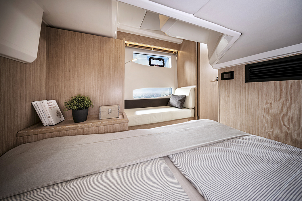Il Bavaria SR 33 asseconda, ancor più dei fratelli maggiori, le esigenze di chi ama una crociera dinamica e sportiva, concentrandosi sulla vivibilità degli spazi di coperta, ma senza trascurare gli interni. Qui sono stati infatti realizzati quattro posti letto, di cui due si sviluppano in una cabina chiusa realizzata sotto il pozzetto, ma con altezza d’uomo, e due in una matrimoniale di prua allestita in open space ma chiudibile con una tenda per una migliore privacy.