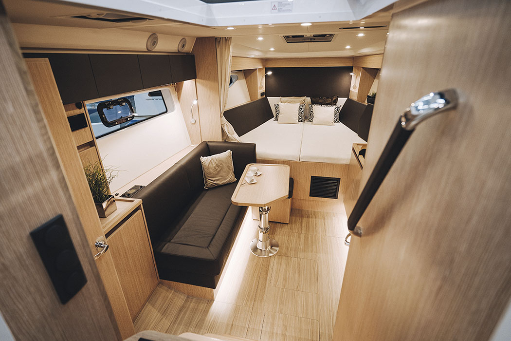 Articolazione degli interni: i quattro posti letto sono suddivisi fra una cabina doppia che si sviluppa sotto la plancia e una matrimoniale di prua in open space. Possono diventare 6 abbassando il tavolo della dinette. Accogliente e ben attrezzato il living.