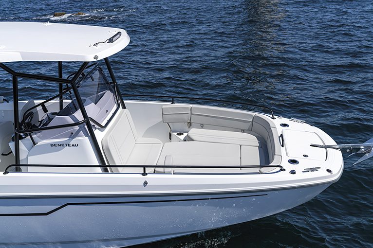 Lo si evince immediatamente osservando l’impostazione del pozzetto che, nel modello che abbiamo provato a Barcellona, oltre alle tre sedute richiudibili, ha una vera e propria postazione da pesca, con una vasca per il vivo e due vasche per il pescato. Il cantiere offre la possibilità di una seconda configurazione, collocando a ridosso dello specchio di poppa un divanetto trasformabile in prendisole. Tutte e due le versioni hanno in comune la possibilità di attrezzare lo specchio di poppa con un’asta per lo sci nautico.