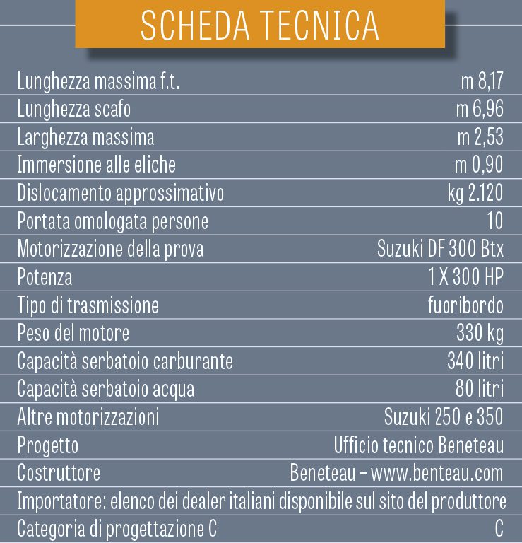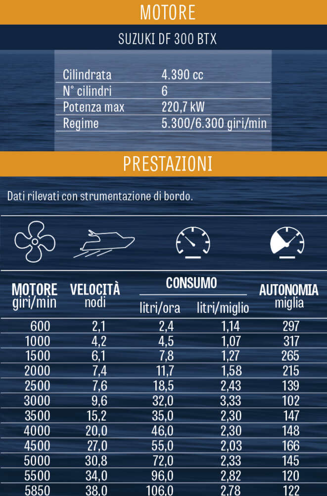La caratteristica che spicca in mare è quella della maneggevolezza. Dimensioni e potenza del motore – nel nostro caso un Suzuki 300 HP – giocano a favore di questa qualità, rendendo la barca divertente da condurre e molto semplice nelle manovre in porto. Molto buona e confortevole intorno ai 30 nodi, la stabilità di rotta è risultata assolutamente accettabile alla massima di 38 nodi, con il pozzetto sempre asciutto e la possibilità di stare comodamente seduti sul divanetto di poppa e sulle sedute laterali.