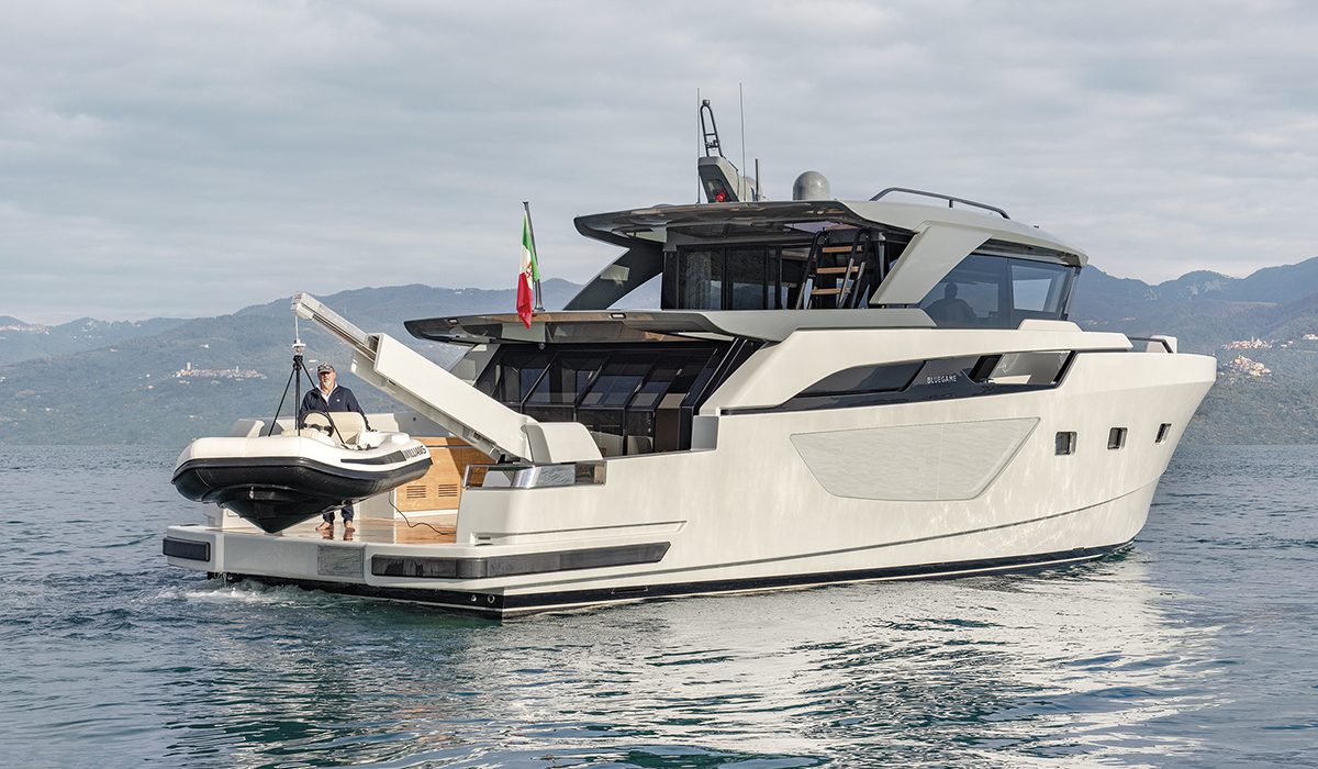 Soluzioni innovative e fuori dagli schemi già apprezzate sul BGX70, vincitore del Motor Boat Awards nella categoria Custom a Düsseldorf, riproposte in scala più compatta sul modello di questa prova: concept di Luca Santella, carena di Codega Associates, esterni e interni di Zuccon International Project. Già dalla banchina il BGX60 colpisce per linee pulite, senza leziosità, facilmente riconoscibili. Le murate alte e la prua imponente e poco inclinata gli conferiscono un aspetto “muscolare”, mentre il parabrezza della tuga e alcuni elementi esterni, tutti a inclinazione inversa, danno al profilo uno slancio assai particolare.