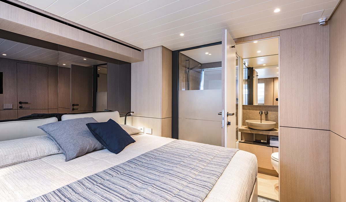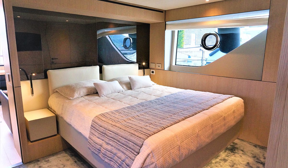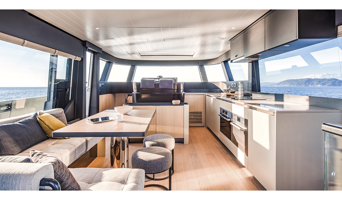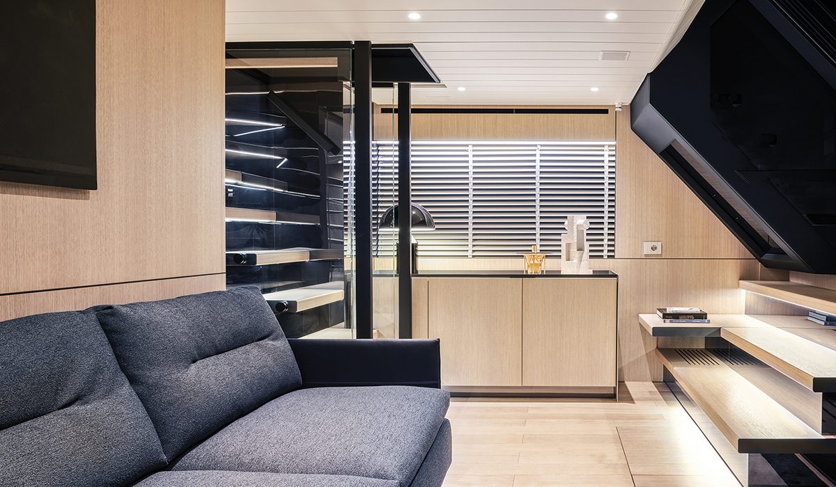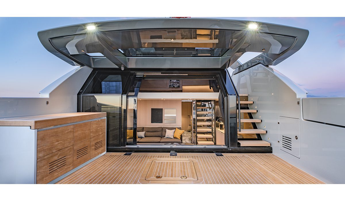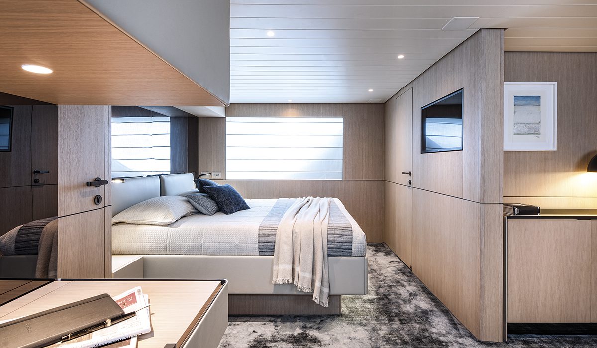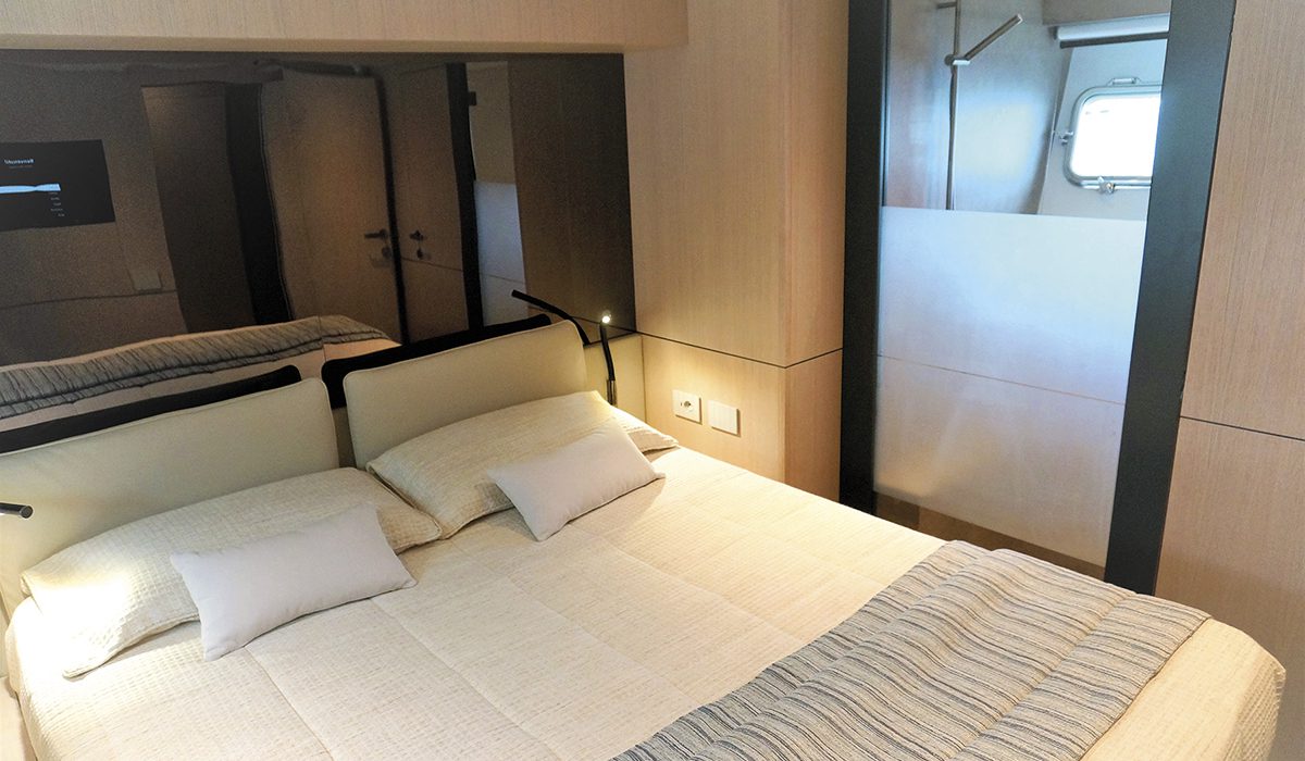 A bordo si nota immediatamente l’impronta innovativa, con un ponte di poppa aperto dotato di mobile bar/cucina, a creare un ampio prendisole sul mare, utilizzabile anche per riporre il tender e movimentarlo tramite un’apposita gru idraulica a scomparsa. Con pochi scalini si discende, attraverso spettacolari porte vetrate scorrevoli, al luminoso salone del ponte inferiore – con vetrate a scafo, divano-letto, tv a scomparsa e scala che conduce al living del main deck – che funge da filtro rispetto alla cabina armatoriale, così ampia da sembrare riportata da un superyacht. Interni che nelle loro rifiniture reinventano con eleganza il classico look nautico, soprattutto grazie all’attenta scelta di rivestimenti ed essenze.