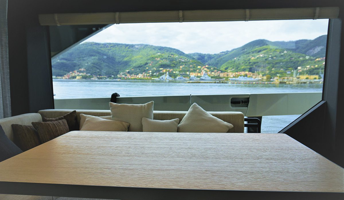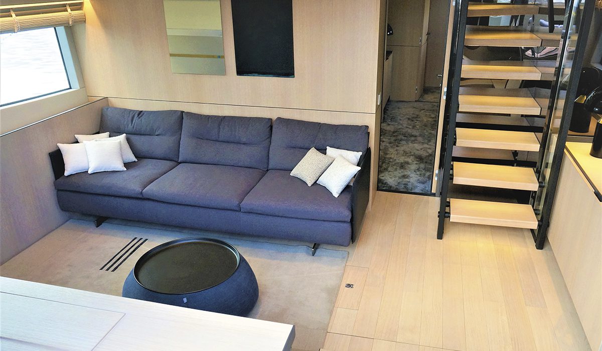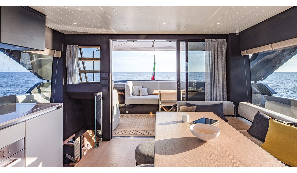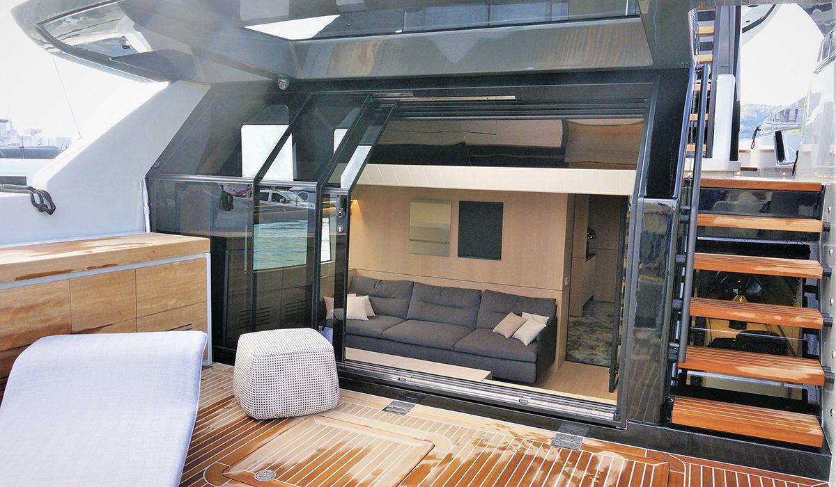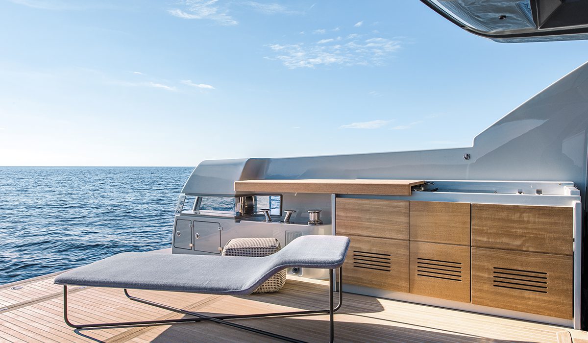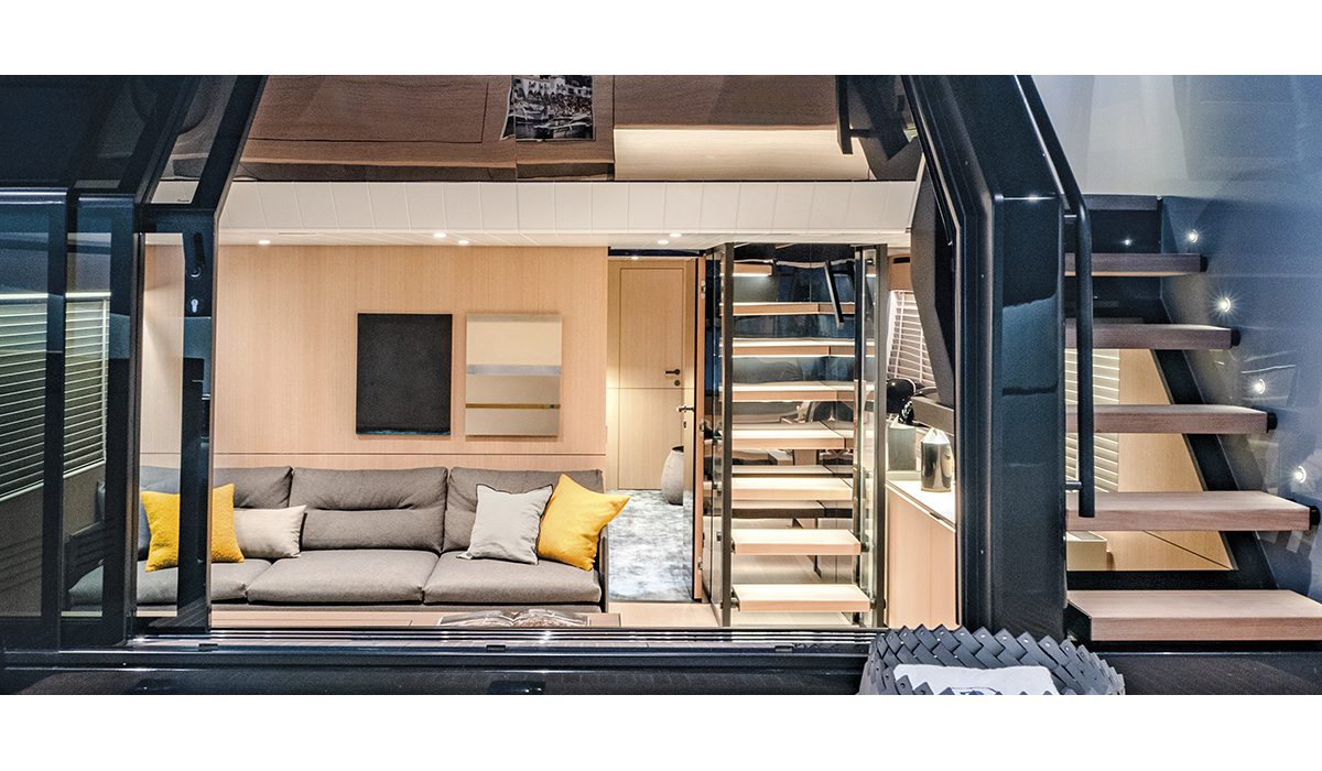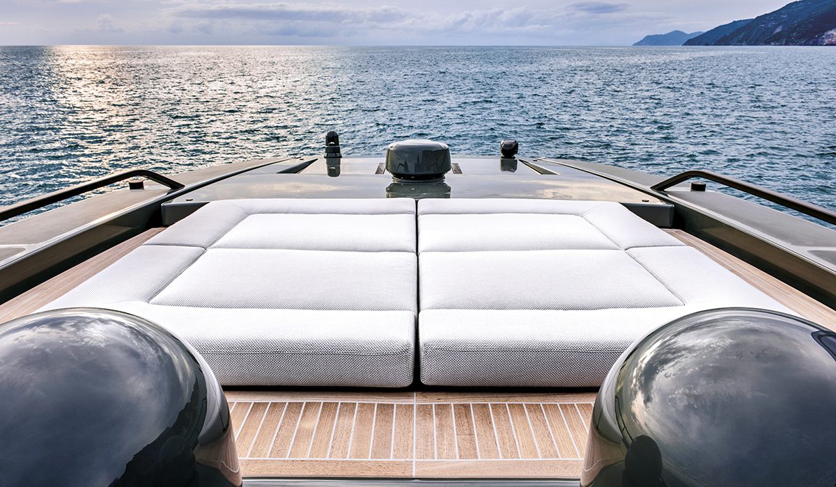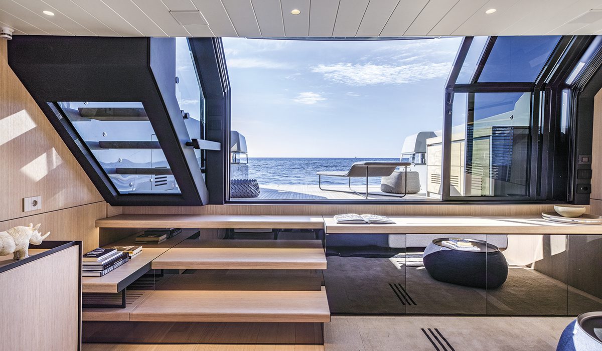 A bordo si nota immediatamente l’impronta innovativa, con un ponte di poppa aperto dotato di mobile bar/cucina, a creare un ampio prendisole sul mare, utilizzabile anche per riporre il tender e movimentarlo tramite un’apposita gru idraulica a scomparsa. Con pochi scalini si discende, attraverso spettacolari porte vetrate scorrevoli, al luminoso salone del ponte inferiore – con vetrate a scafo, divano-letto, tv a scomparsa e scala che conduce al living del main deck – che funge da filtro rispetto alla cabina armatoriale, così ampia da sembrare riportata da un superyacht. Interni che nelle loro rifiniture reinventano con eleganza il classico look nautico, soprattutto grazie all’attenta scelta di rivestimenti ed essenze.