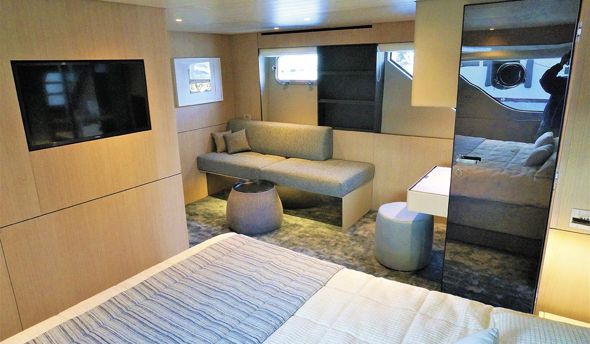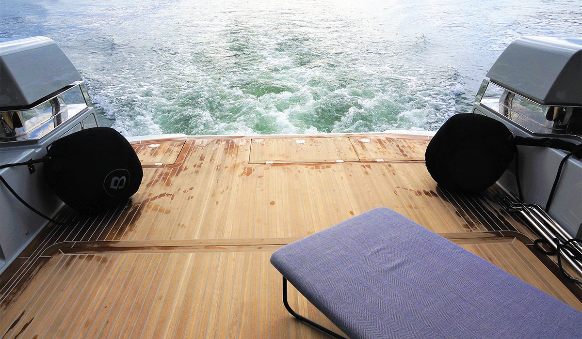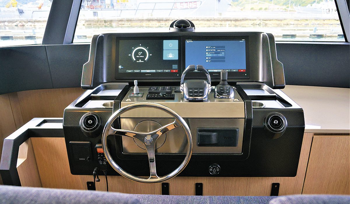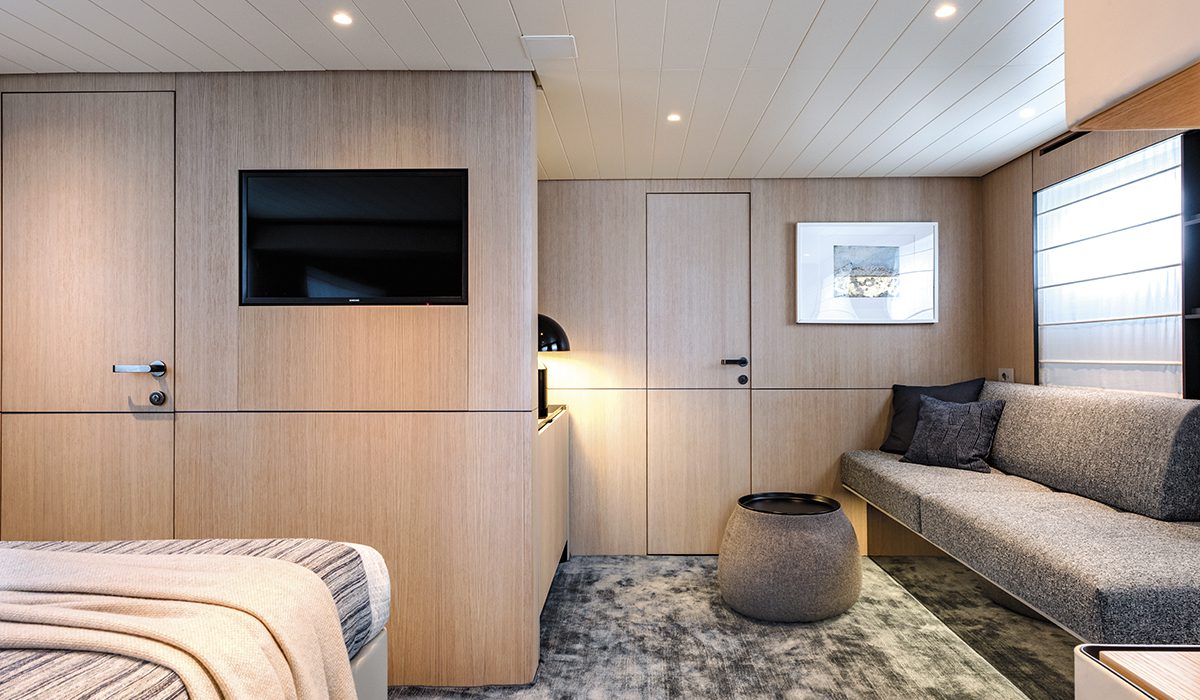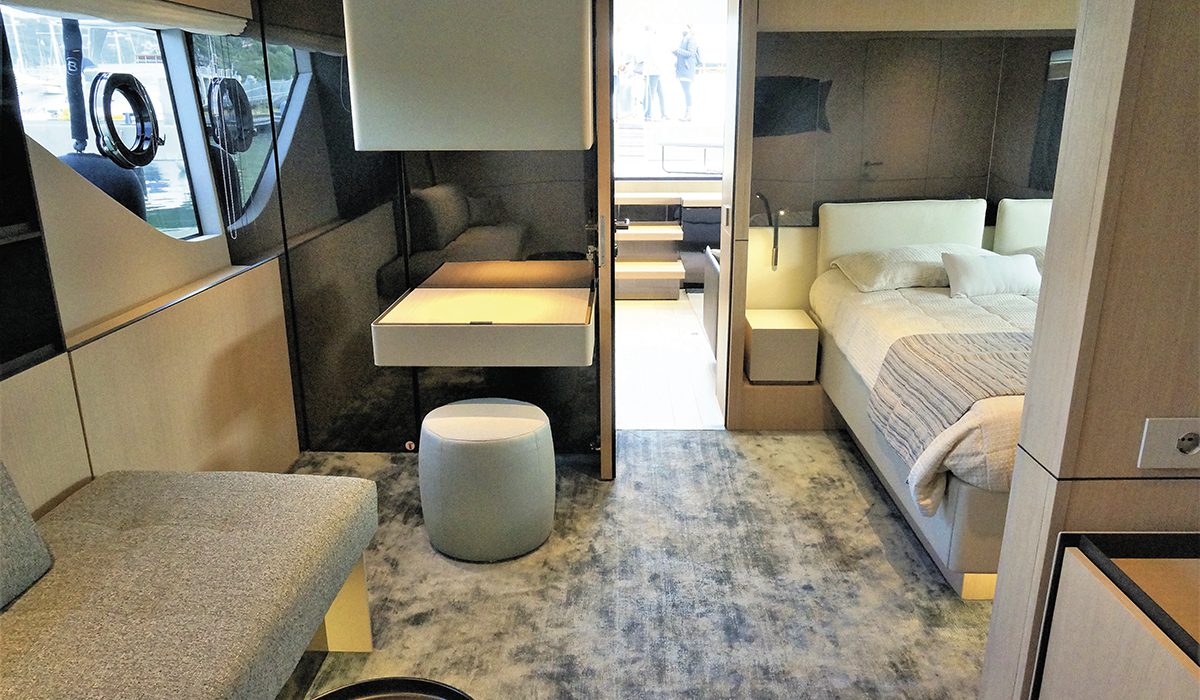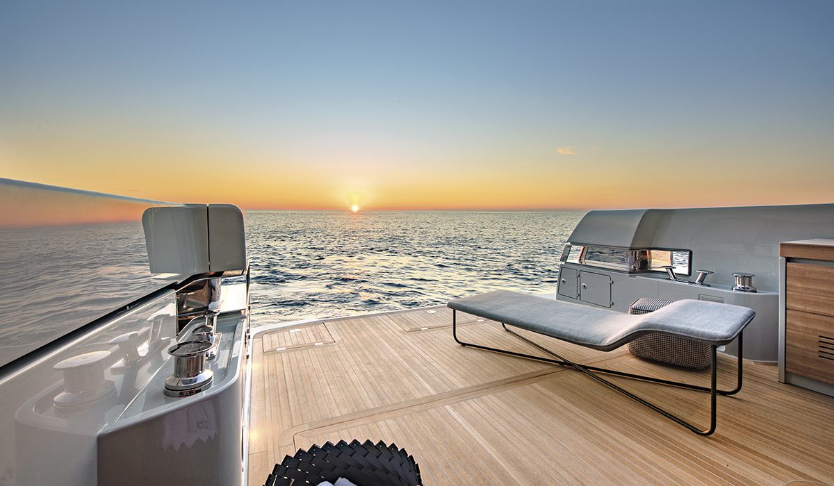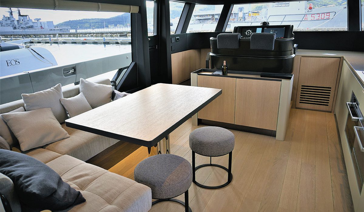 A bordo si nota immediatamente l’impronta innovativa, con un ponte di poppa aperto dotato di mobile bar/cucina, a creare un ampio prendisole sul mare, utilizzabile anche per riporre il tender e movimentarlo tramite un’apposita gru idraulica a scomparsa. Con pochi scalini si discende, attraverso spettacolari porte vetrate scorrevoli, al luminoso salone del ponte inferiore – con vetrate a scafo, divano-letto, tv a scomparsa e scala che conduce al living del main deck – che funge da filtro rispetto alla cabina armatoriale, così ampia da sembrare riportata da un superyacht. Interni che nelle loro rifiniture reinventano con eleganza il classico look nautico, soprattutto grazie all’attenta scelta di rivestimenti ed essenze.