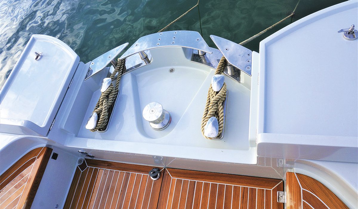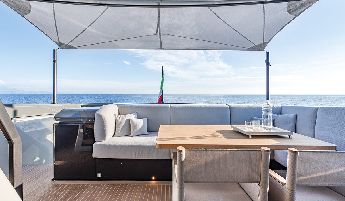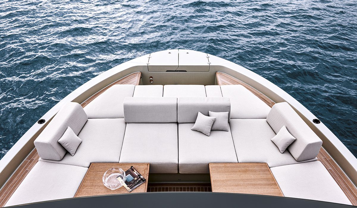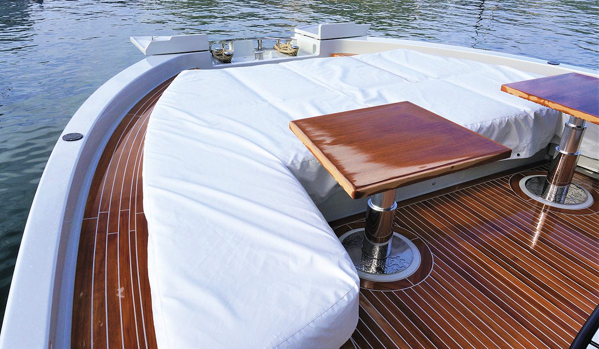 Caratterizzata da grande ampiezza e opportunamente attrezzata con una coppia di tavoli fissi e un ampio prendisole con schienali e bimini, l’area prodiera assume un ruolo importante come living esterno. Le murate si mantengono protettive fino all’estrema prua e offrono un notevole senso di sicurezza.
