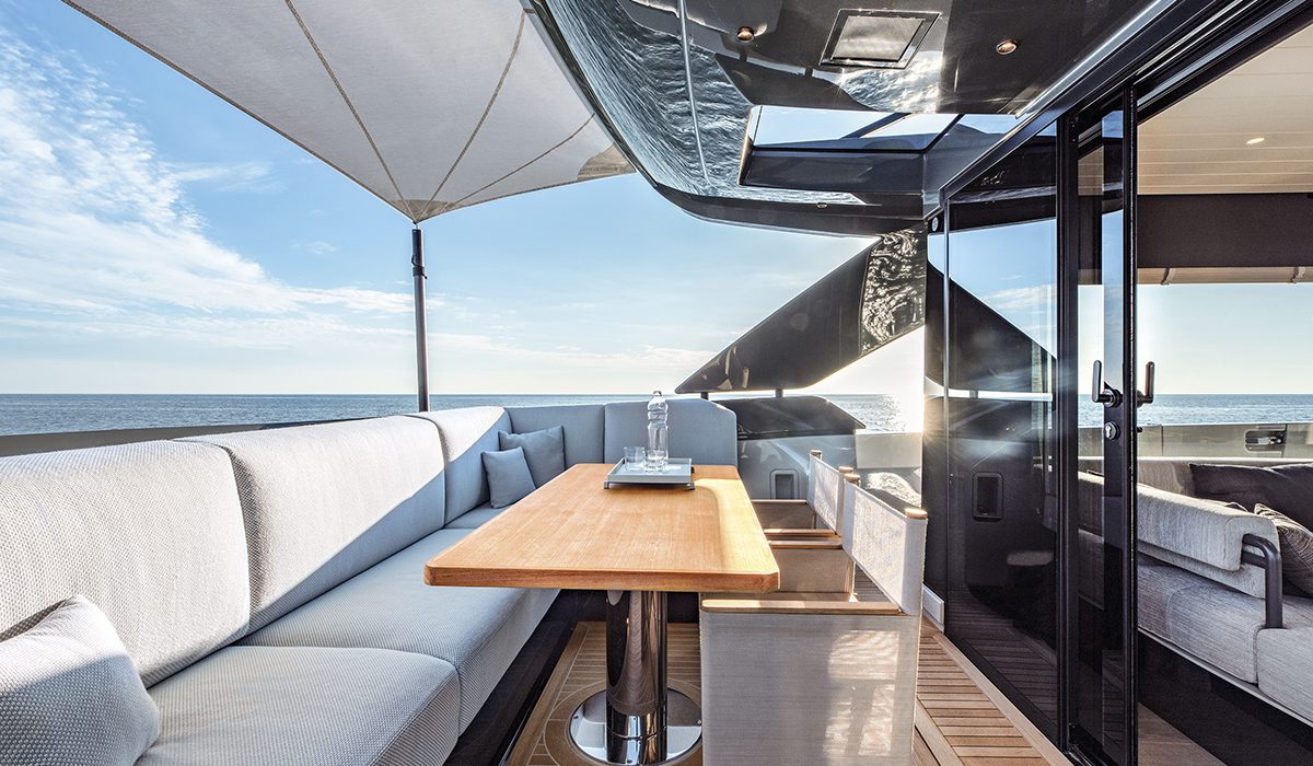 A completare gli spazi esterni, salendo all’ultimo livello si accede al prendisole panoramico posto sulla tuga.