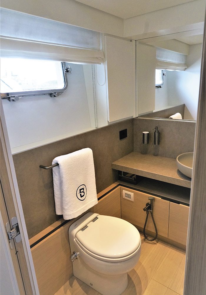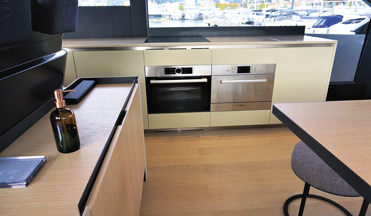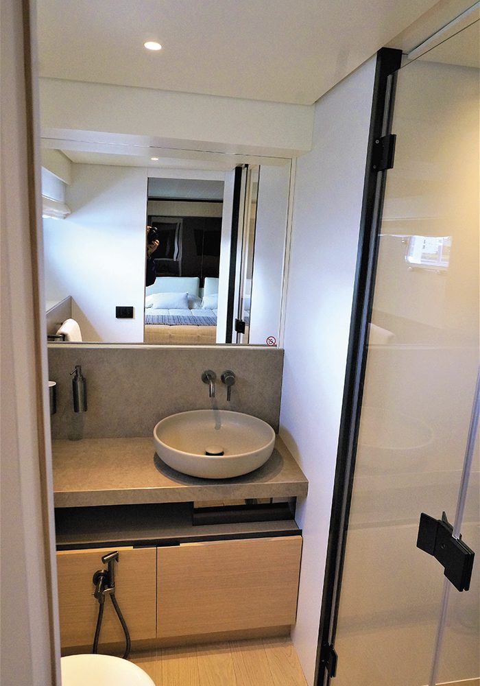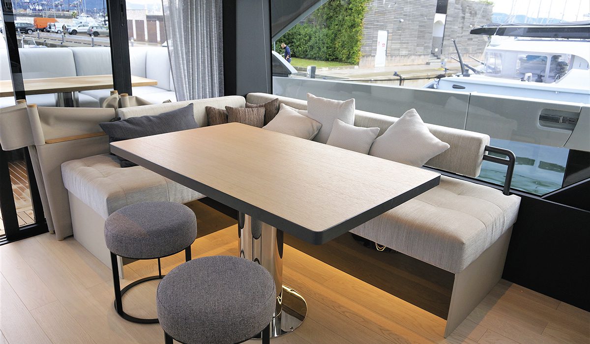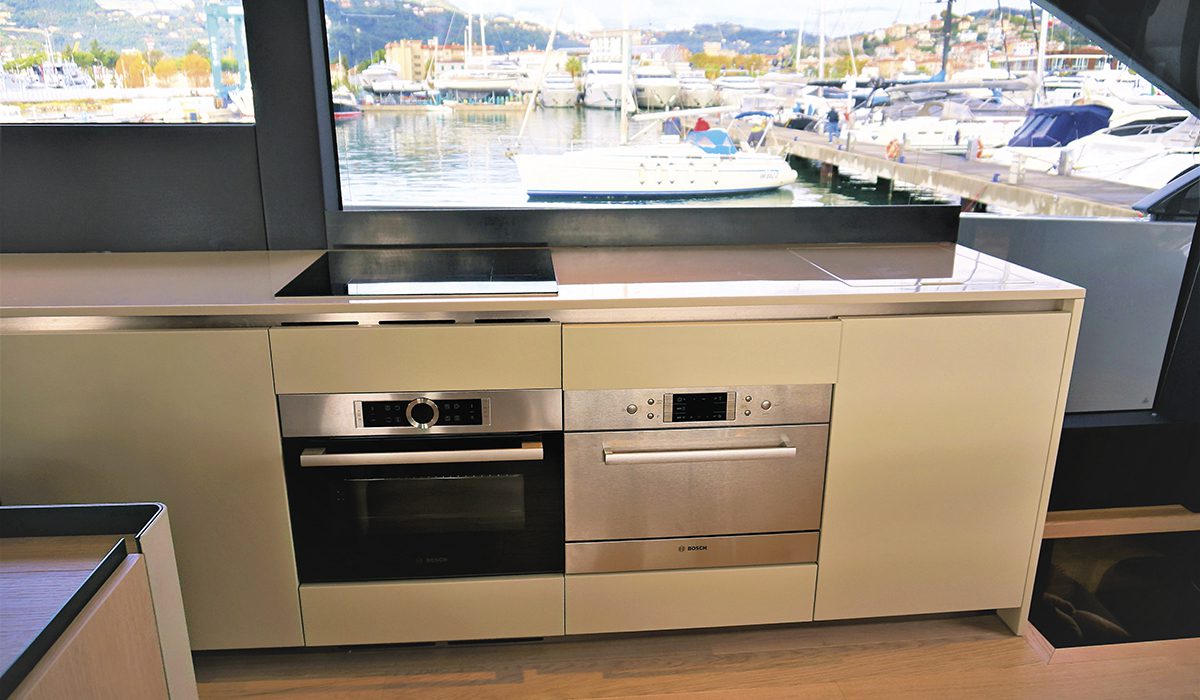 Detto ciò, sono disponibili altri layout – per esempio con tre cabine – tutti comunque improntati a uno sfruttamento dei volumi quasi maniacale, fatto questo, che fa percepire l’imbarcazione più grande del reale. Senza contare che a tale effetto amplificatore concorrono le ampie superfici vetrate apribili, il continuo rapporto interno-esterno, l’uso di colori e materiali chiari.