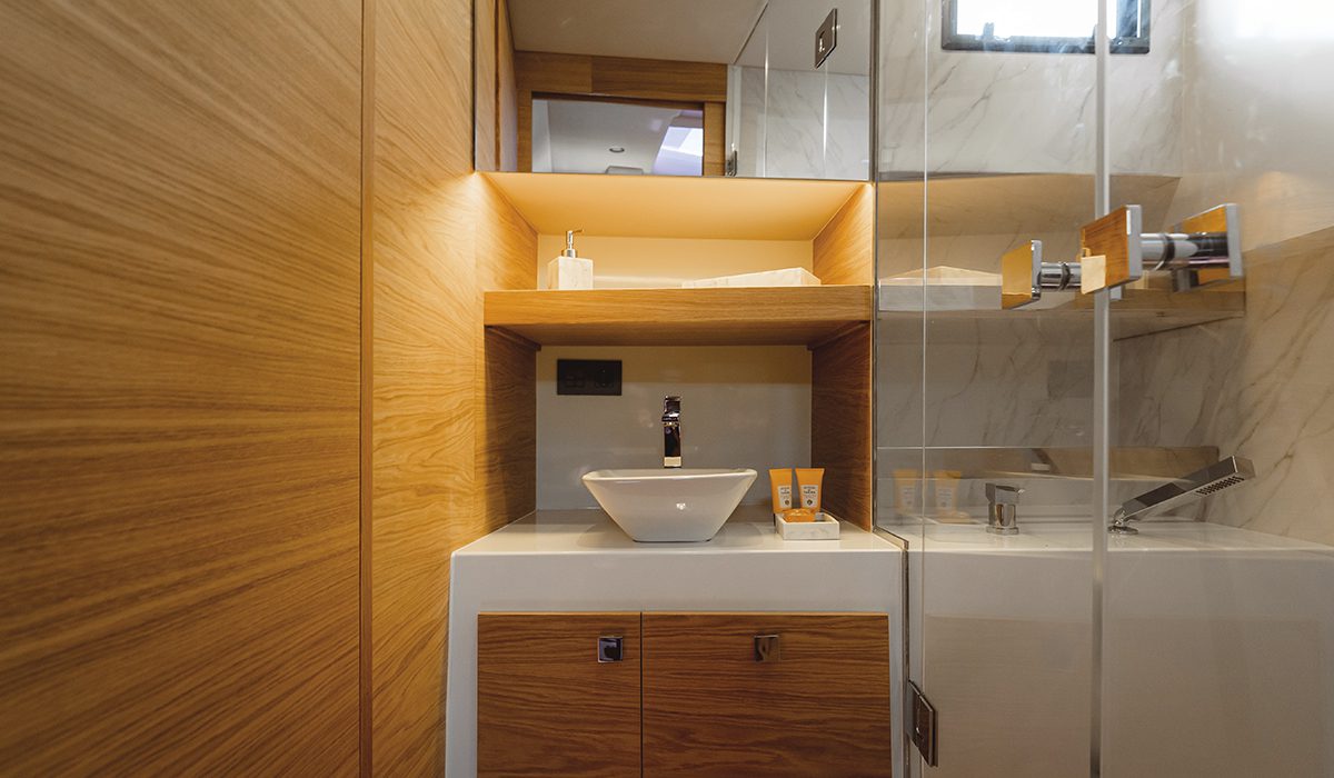 Marc De Antonio e Stan Chmielewski, oltre che proprietari del cantiere, sono anche, per formazione, due ottimi designer. Nel caso del D50, sembra che abbiano lavorato sui volumi interni per allestirli immaginando diverse tipologie di armatore. La configurazione standard prevede una cabina armatoriale a prua, una dinette a tutto baglio a poppa con il divano convertibile in un grande letto, e una toilette con doccia. A nostro avviso si tratta dell’organizzazione con il miglior equilibrio fra spazio a disposizione e persone imbarcate.