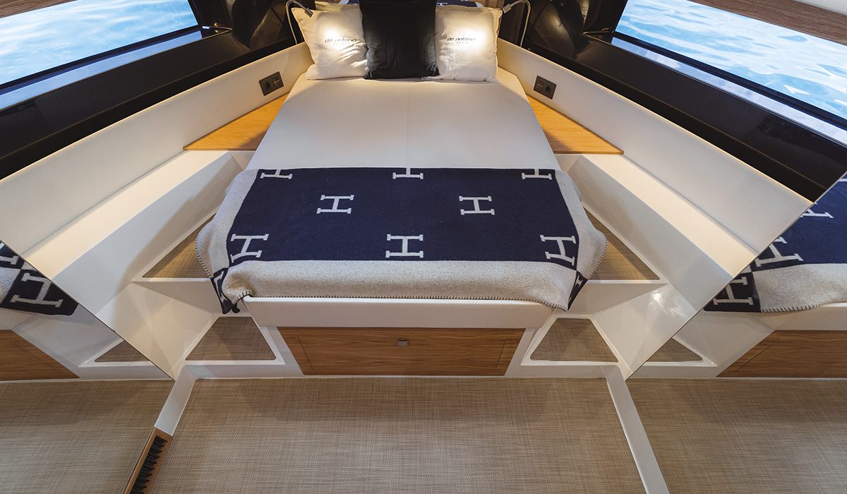 Per quanto riguarda il primo aspetto, certamente le dimensioni aiutano a valorizzare la naturale caratteristica di libertà di movimento tipica di un walk-around. Nel caso di questo open, il plus deriva da una particolare attenzione ai dettagli, all’organizzazione degli spazi che ha permesso, per esempio, di realizzare una dinette esterna ottimamente attrezzata senza renderla ingombrante, o di rendere molto fluidi i movimenti, lavorando su maggiori larghezze nei passaggi e sulla sicurezza, studiando e posizionando tientibene e appigli ovunque.