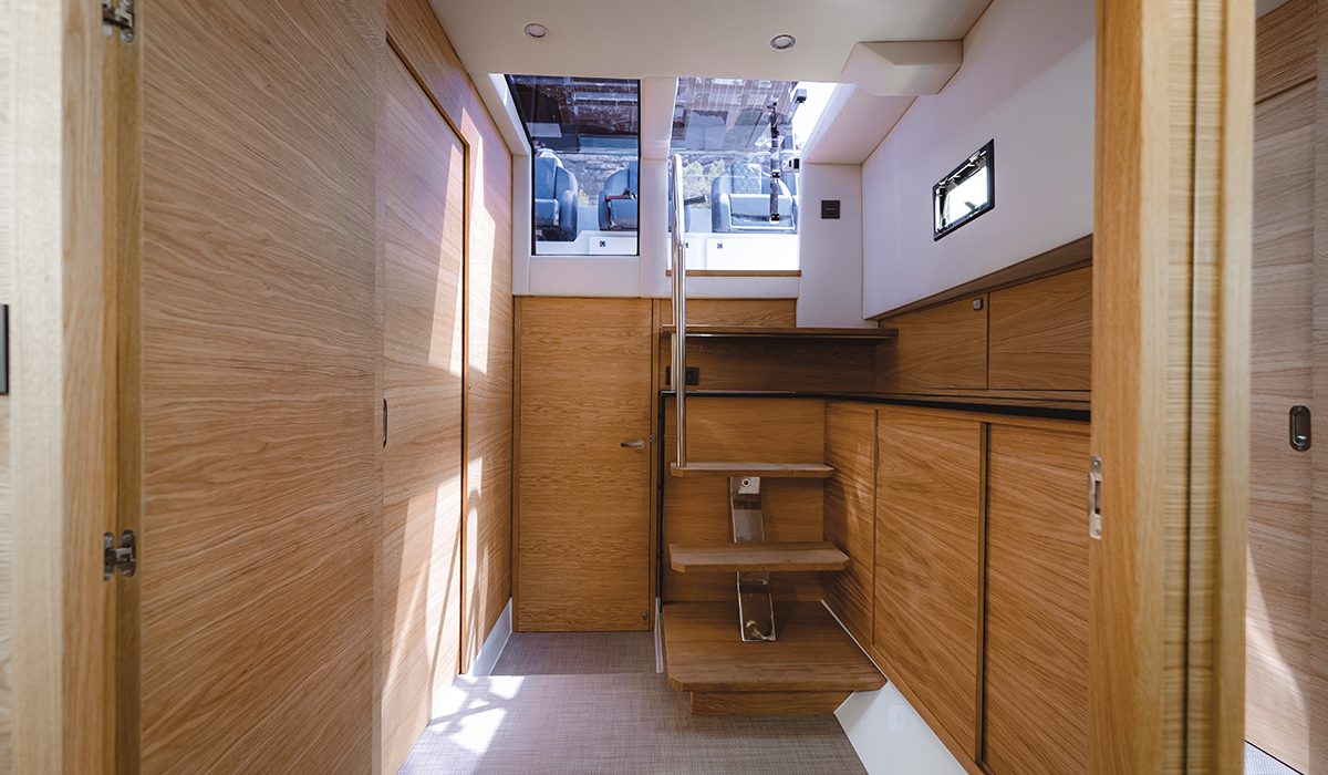 Infine, ecco la configurazione che consente di imbarcare un uomo di equipaggio: due cabine doppie con cabina marinaio e relativi servizi.