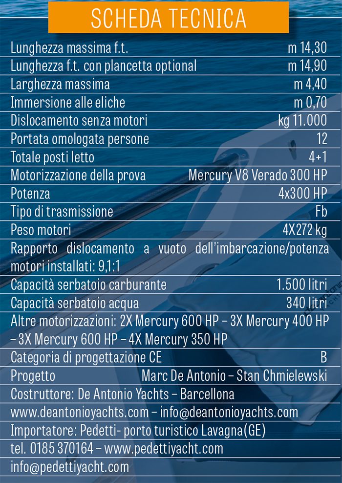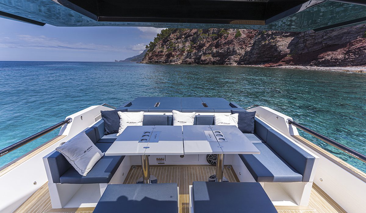 La nuova ammiraglia del cantiere spagnolo presenta tutti i tratti distintivi della gamma. Innanzitutto i fuoribordo occultati, soluzione non inedita, ma adottata per la prima volta con grande efficacia e successo commerciale proprio da De Antonio, anche per la facilità di accesso e ispezione attraverso il vano celato dal grande prendisole di poppa.