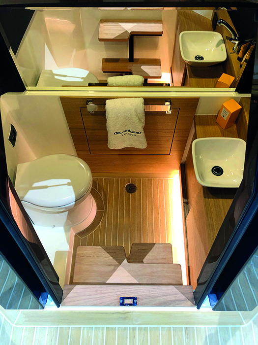 Due parole a proposito della postazione di guida. Non abbiamo trovato particolarmente comode le sedute del pilota ma, in compenso, abbiamo apprezzato la razionale disposizione degli strumenti, che favorisce la lettura dei dati di navigazione, e dei comandi, che sono sempre sotto mano. Inoltre, la console cela al suo interno un locale servizi di dimensioni davvero importanti: siamo su una barca di 8,50 metri e al centro, con ingresso verso prua, troviamo una toilette davvero completa, con altezza interna superiore al metro e ottanta.