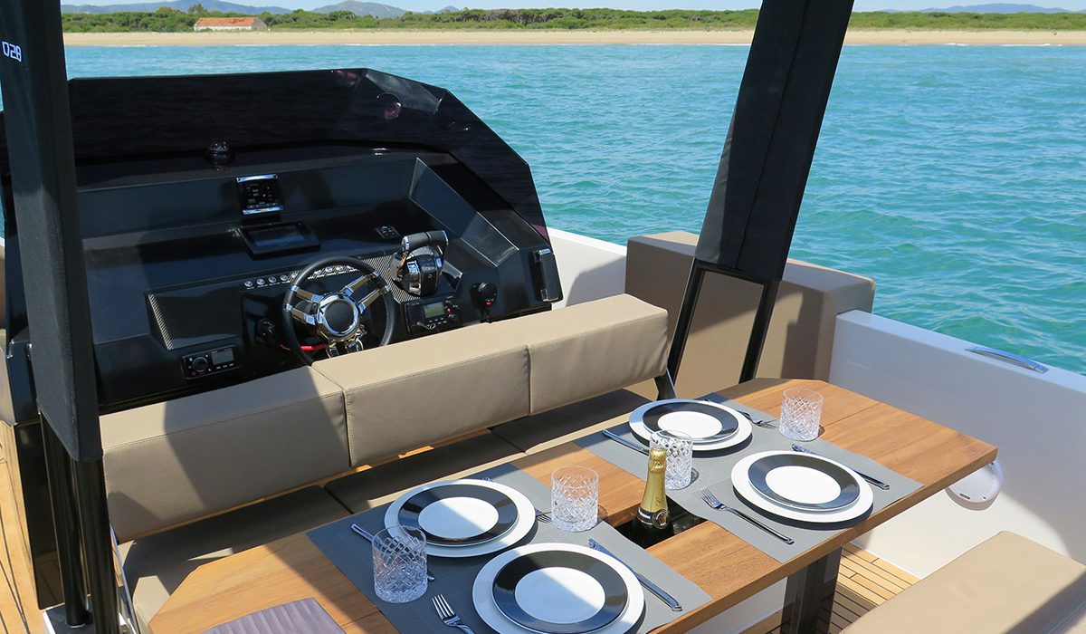 Ma è muovendo i primi passi verso prua che ci si accorge dell’ottima ergonomia della barca. Il D28 è un walkaround che in poco spazio non rinuncia a offrire tanta libertà di movimento e tre distinti ambienti molto ben attrezzati: il solarium a poppa, la zona pranzo a ridosso della plancia e una vera e propria dinette a prua.