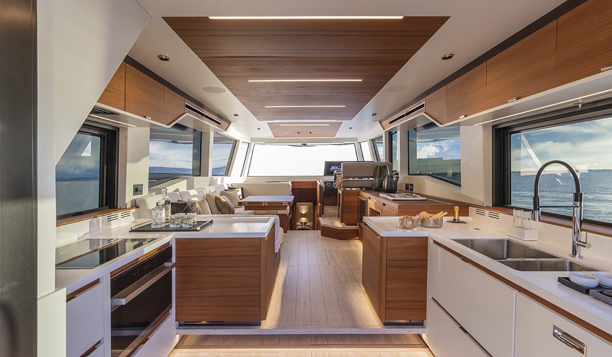 All’esterno, salta agli occhi come il concept della barca parta dal pozzetto. Una terrazza su mare che si dispiega in oltre 40 metri quadrati con le due murate aperte verso l’esterno. Da qui si può accedere alla plancia di poppa, regolabile in altezza con un sistema idraulico, oppure salire sul flybridge, arredato con divani, lettino prendisole, una seconda timoneria completa e il mobile frigo.
