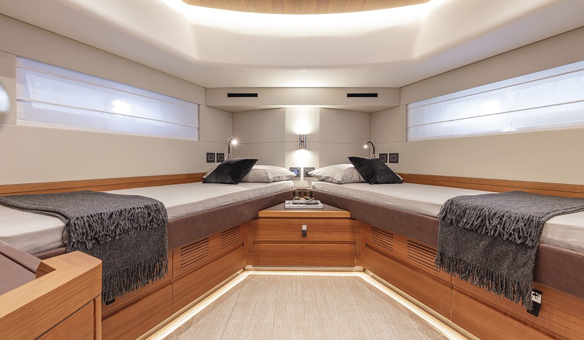 Nel ponte inferiore è stata organizzata la zona notte, con la cabina dell’armatore a centro barca, la Vip a prua con letti separati o un matrimoniale, e una cabina ospiti. Una configurazione standard che può essere personalizzata soprattutto per quanto riguarda materiali, tessuti e colori.
