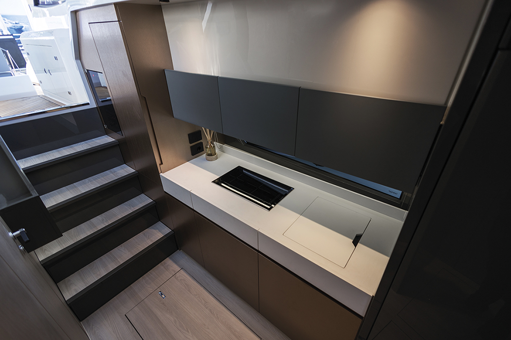Piccole chicche come le canaline integrate per la chiusura laterale del pozzetto con appositi teli, oppure le aree antisdrucciolo realizzate sopra all’hard top per agevolare le operazioni di manutenzione delle antenne e, su questa unità, delle lamelle apribili. Tutto, insomma, dimostra l’attenzione del cantiere ai minimi dettagli.