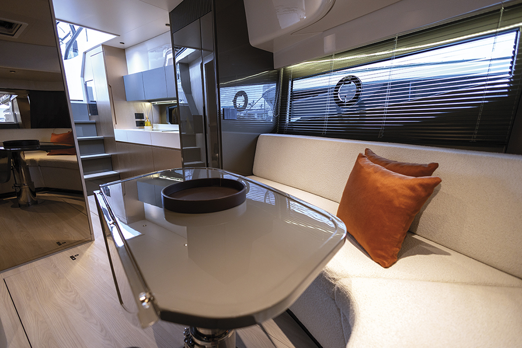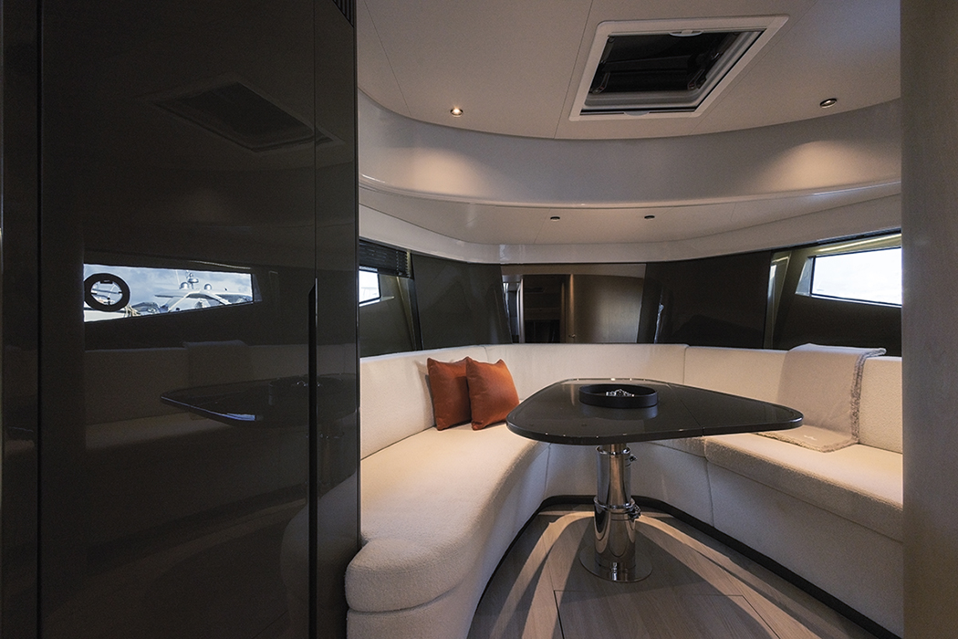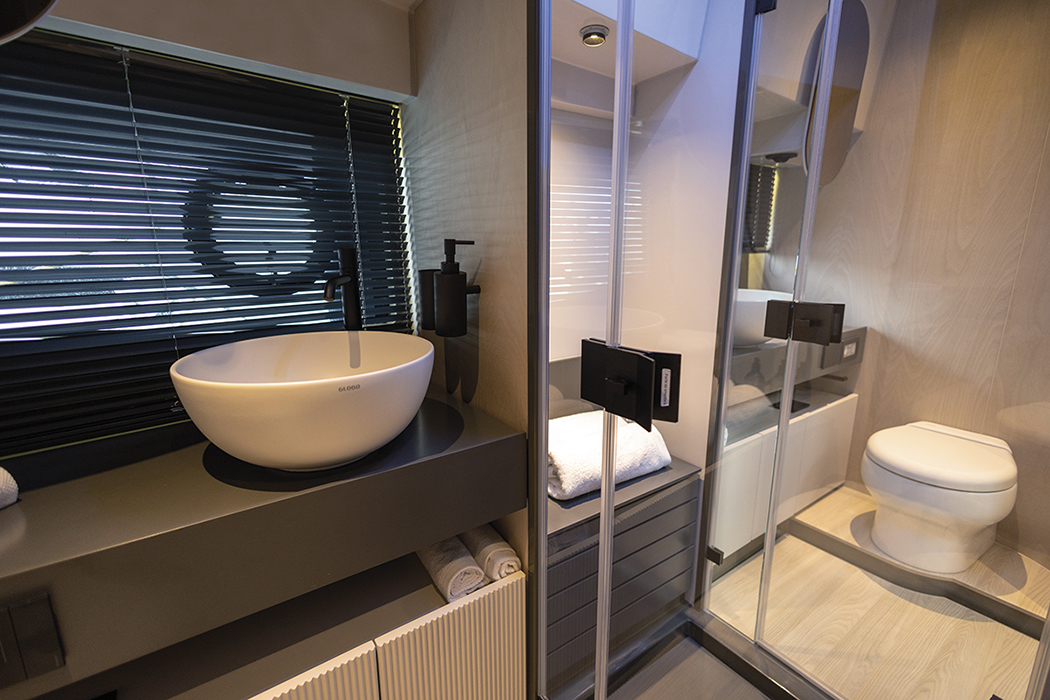 Una cura che si riscontra anche negli interni, tanto nei materiali utilizzati quanto nello studio del layout, quest’ultimo caratterizzato da una classica dinette a “V” di prua, convertibile in matrimoniale e separabile da una paratia a scomparsa, una cabina armatoriale di poppa con letto posto per madiere e due locali toilette con box doccia in comune, soluzione che permette di avere due ambienti di dimensioni dignitose in una barca tutto sommato compatta.