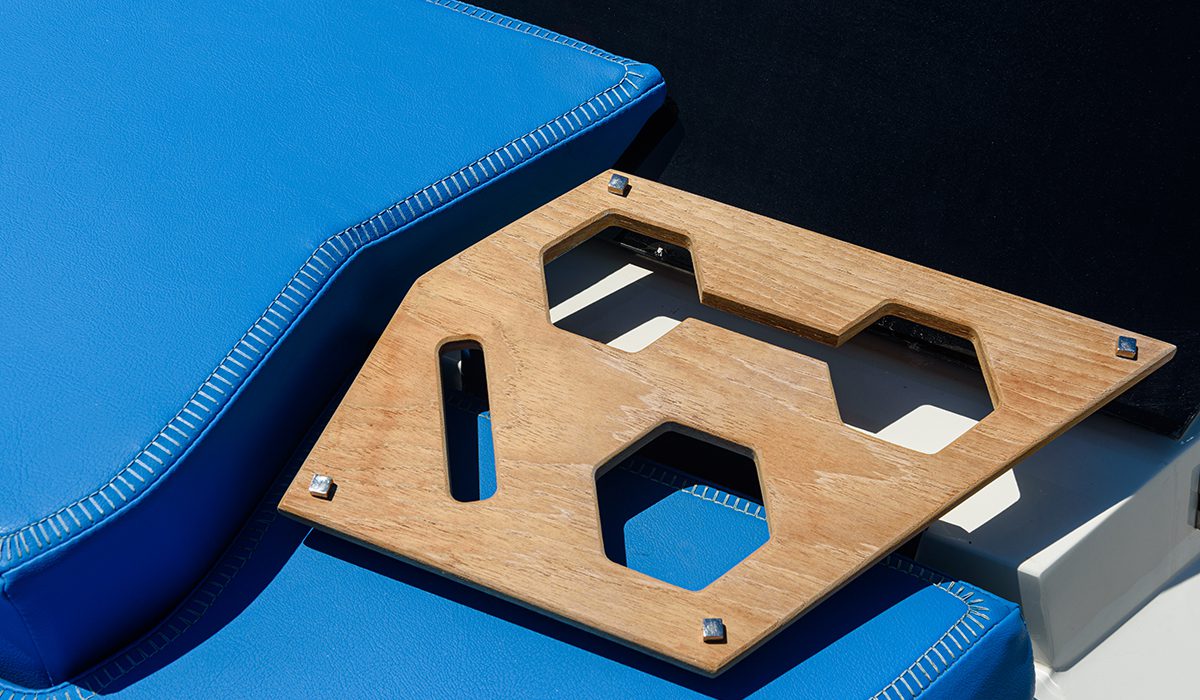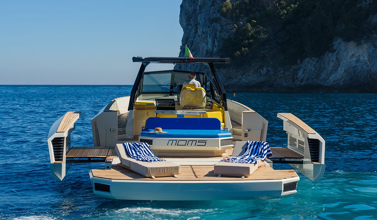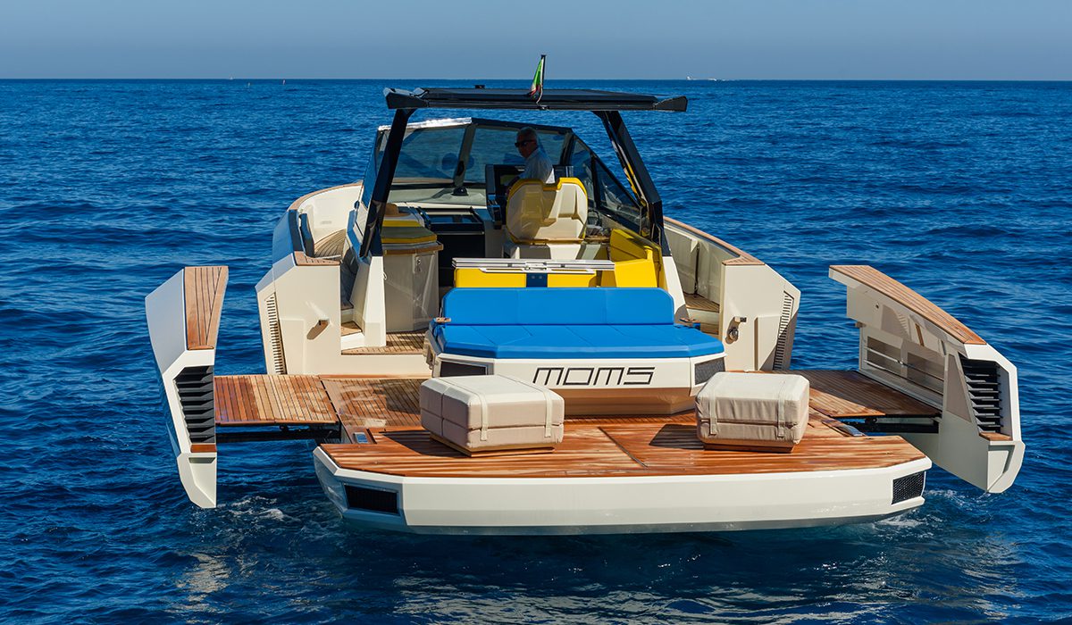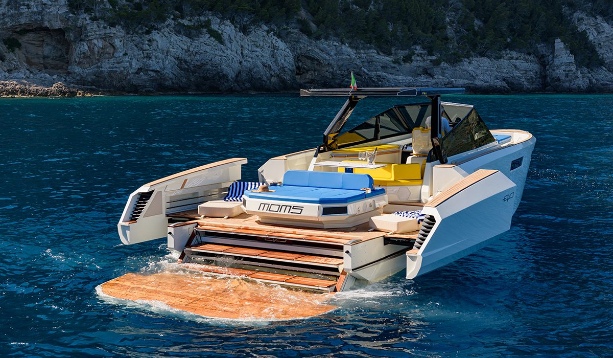 Le nuove soluzioni tecnologiche progettate da Rivellini e prodotte da Besenzoni hanno dato vita ad una beach area con tanti elementi in movimento, fra cui spicca un tender lift ben poco diffuso, se non inedito, per una barca di 40 piedi. Si tratta di una piattaforma in grado di abbassarsi per 80 centimetri sotto il livello del mare ma anche di estendersi per facilitare l’imbarco e lo sbarco da banchine molto alte. Inoltre, le sue dimensioni – soprattutto la larghezza – permettono di utilizzarla per lo sbarco e l’imbarco senza dover rimuovere il tender o la moto d’acqua eventualmente presenti.