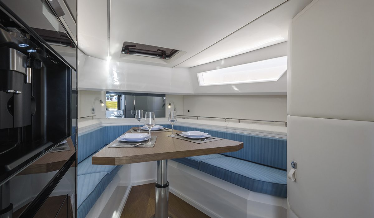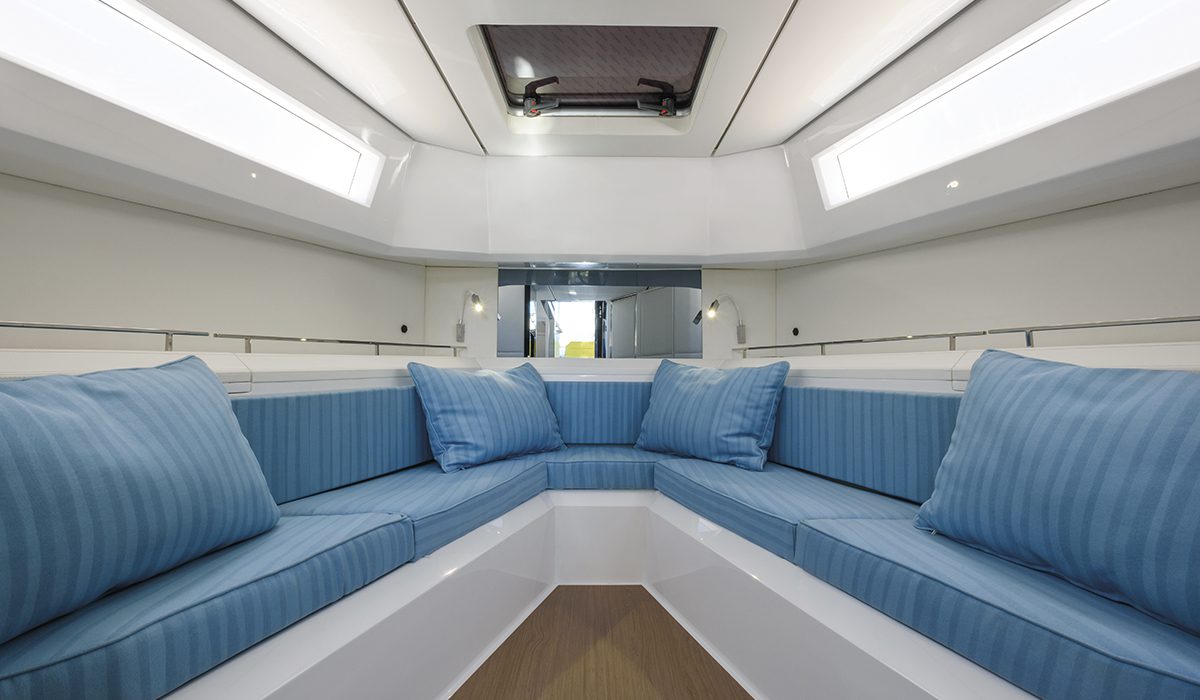 Con le due sponde apribili e estendibili si completa un’ampia superficie al centro della quale spicca un divano prendisole seguito, verso prua, da un tavolo da pranzo multifunzione.