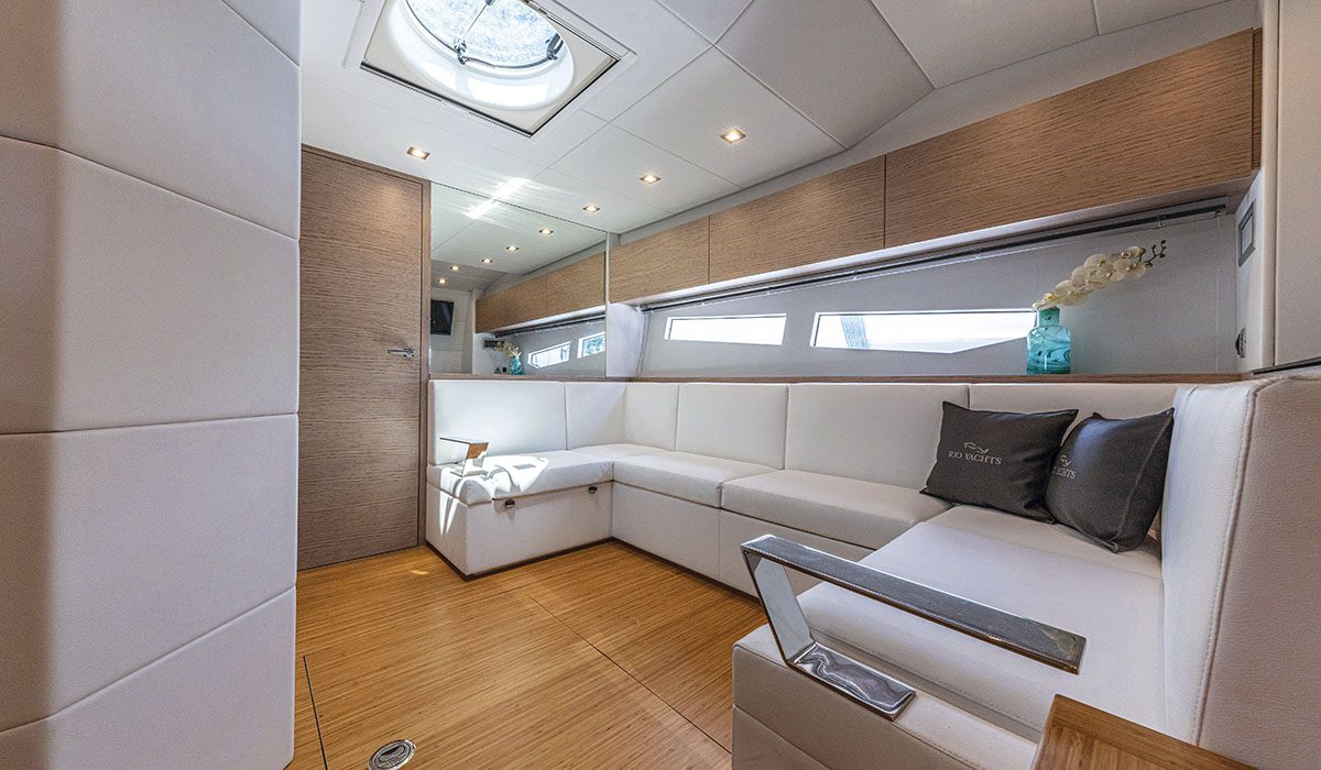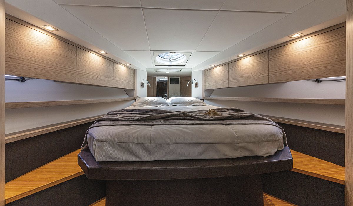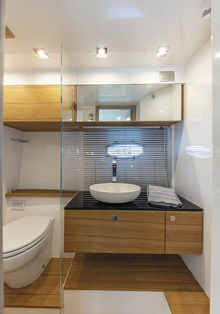 Considerando pure la dinette trasformabile, si può arrivare a un totale di ben 7 posti letto. Se si pensa che stiamo parlando pur sempre di un open, si comprende bene come a questo punto sia difficile dire quale sia, tra interno ed esterno, il piatto forte dell’allestimento. Sta di fatto che il pozzetto è organizzato in modo tale da consentire agli ospiti di trascorrervi gran parte della giornata, che si tratti di navigazione o di sosta in ancoraggio, grazie soprattutto alla trasformabilità di alcuni elementi (come il divano-prendisole e il tavolo su colonna regolabile elettricamente), alla presenza di una cucina attrezzata (che non ha molto da invidiare a quella interna) e all’ottimo collegamento sia con la plancetta di poppa – che, su richiesta, può essere del tipo up&down da 600 kg – sia, attraverso il passavanti di dritta, con l’area di prua convenientemente attrezzata a prendisole.