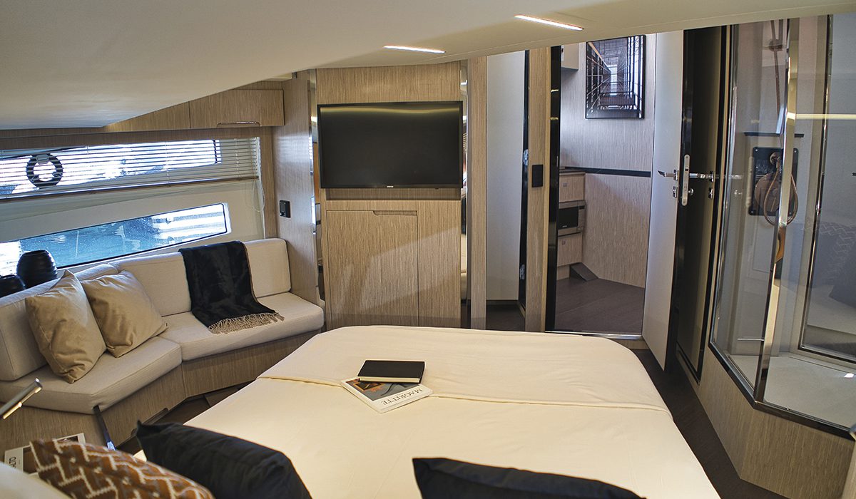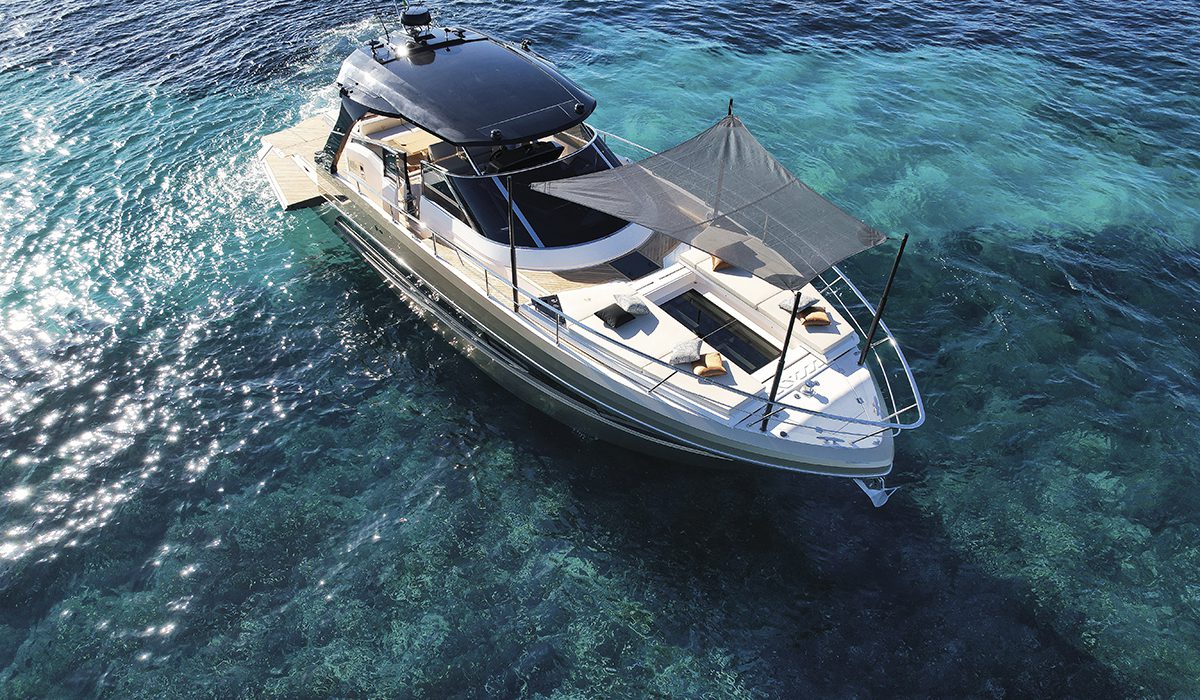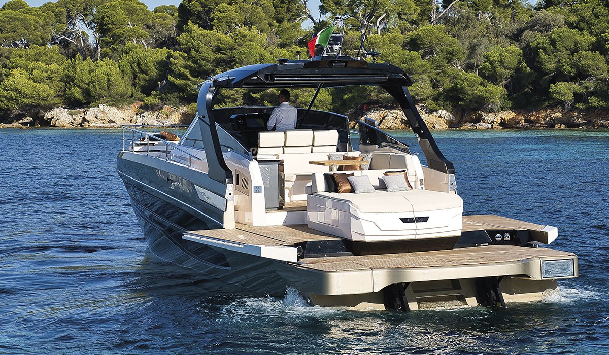Si tratta del 470 Regina, un open in cui il concetto di Bow Life trova la sua massima applicazione. Il grande solarium di prua, infatti, può essere diviso in due metà che traslano lateralmente dando vita a una beach area. È stato questo uno degli elementi di innovazione che hanno maggiormente attirato l’attenzione della giuria che ha premiato la barca, anche perché, mediante l’utilizzo di pompe, questo ambiente può essere riempito con acqua marina, creando così una piccola piscina o, forse più propriamente, una grande vasca.