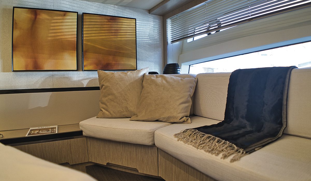 Al centro dello spazio ricavato si può invece scegliere di installare un tavolo, ottenendo così una zona pranzo aggiuntiva. Inoltre, questa soluzione garantisce un’ottima illuminazione naturale alla cabina di prua, che si trova sotto il vetro rinforzato di quest’area.