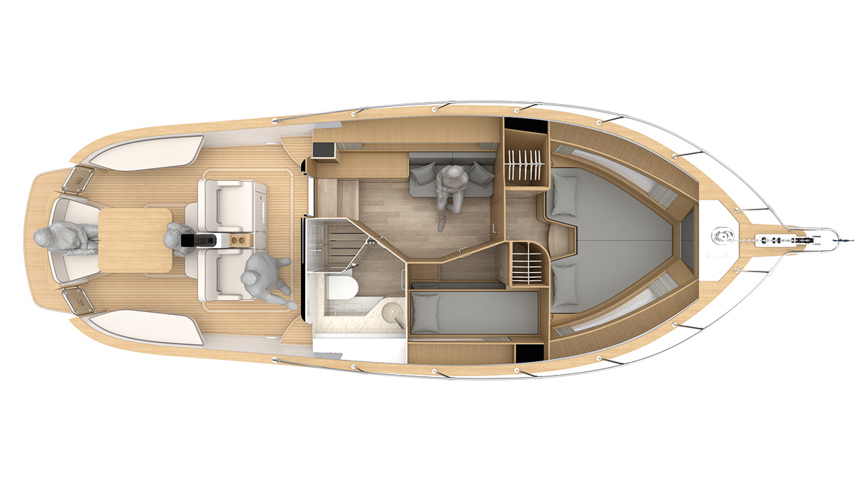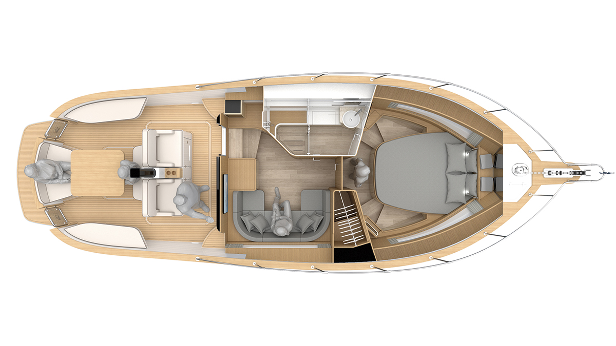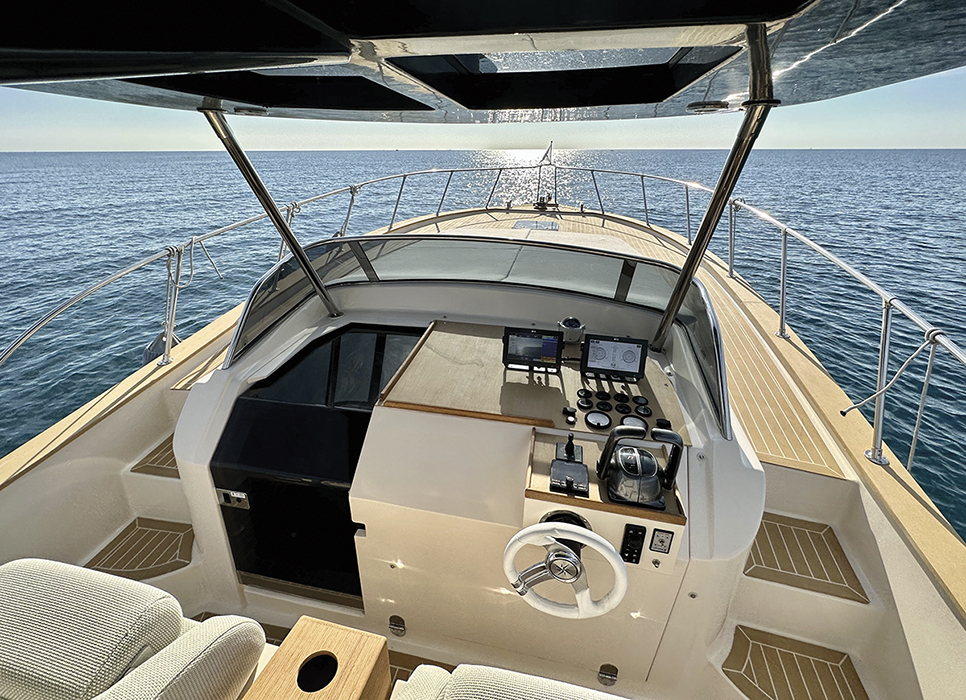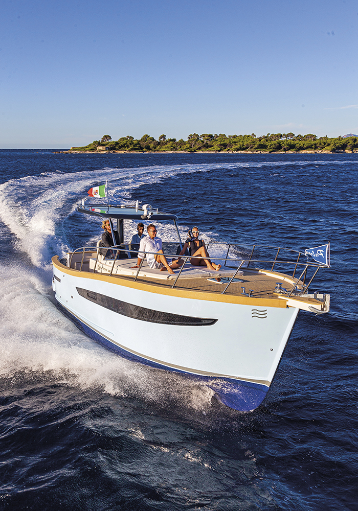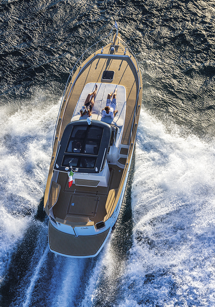 Si voleva un daycruiser con chiari richiami alla tradizione dei gozzi liguri e dei modelli che hanno fatto la storia del cantiere: da qui, per esempio, la scelta di mantenere la delfiniera. Al contempo però doveva essere abitabile non solo all’aperto ma anche sottocoperta. Un modello, quindi, sportivo e vivibile, capace di conquistare i tradizionali armatori del cantiere, ma anche catturare l’attenzione della nuova generazione di diportisti, molto attenti alle prestazioni e alla praticità d’uso della barca.