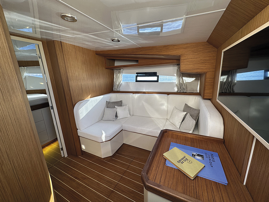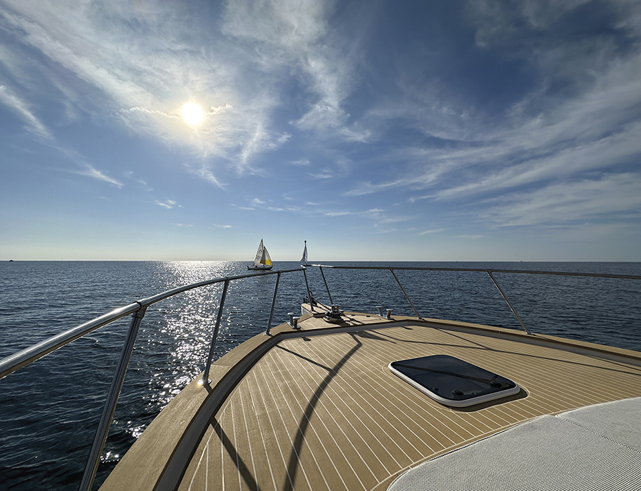 Questa spiega l’introduzione della motorizzazione fuoribordo e l’uso del teak ‘ecologico’ in coperta, ma anche un’opera morta importante per garantire all’interno un’altezza assolutamente vivibile, da 1,78 a 1,86 metri a seconda degli ambienti”.