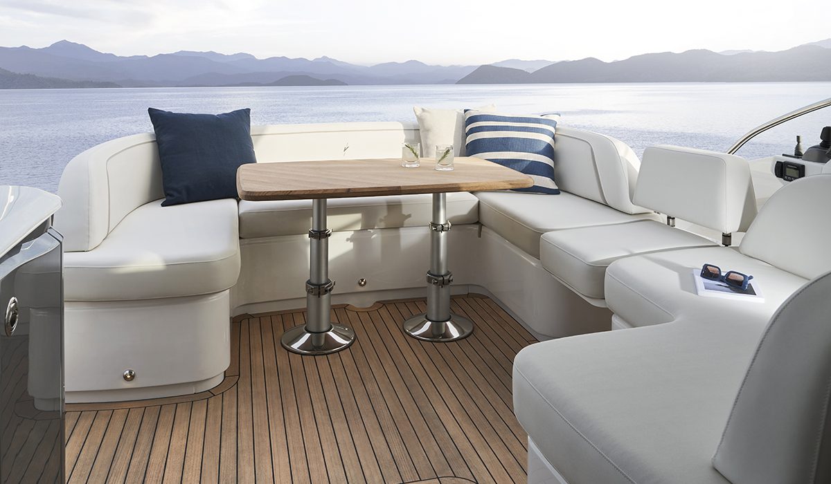 La zona poppiera è stata ottimizzata per migliorarne la fruibilità, con due rampe di scale che circondano lo specchio di poppa collegando la piattaforma – disponibile anche in versione con movimentazione elettroidraulica – con il pozzetto, dove troviamo un accogliente living con divano a “C” e tavolo abbassabile per la trasformazione in prendisole, il tutto protetto dal prolungamento accentuato della sovrastruttura. Una seconda cuscineria di ampie dimensioni si trova a prua.