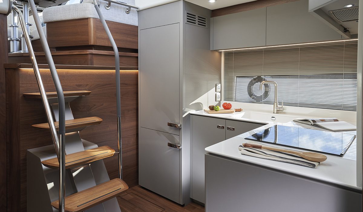 Le ampie finestrature laterali e i tre osteriggi infondono luminosità e ariosità all’intero ambiente, permettendo alla luce naturale di raggiungere anche il ponte inferiore, dove troviamo la zona pranzo costituita da una dinette sulla dritta e dalla cucina sulla sinistra, quest’ultima dotata di piano cottura a induzione, un frigorifero/freezer a tutta altezza e a un forno combo. Le cabine sono due, una matrimoniale a prua e una armatoriale a centro barca, ma su richiesta si può avere una terza cabina al posto della dinette. Due pure i bagni, uno riservato alla cabina armatoriale e l’altro con doppio accesso dalla matrimoniale di prua e dal quadrato, fungendo dunque anche da day toilette.