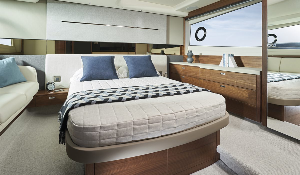 Dal pozzetto, tramite una porta di cristallo, si accede al salone principale, caratterizzato dal consueto e sobrio “charme” che si riscontra su tutti i modelli della casa inglese, dove a farla da padroni sono materiali e finiture di indubbia qualità. Tra le varie proposte, anche sul V50 è possibile scegliere finiture e tinte a contrasto introdotte sulla nuova collezione e che saranno offerte anche sui modelli a seguire. Il layout del quadrato propone un divano a “C” sulla sinistra con mobile TV – a scomparsa – sulla dritta, e si completa con la presenza della timoneria.