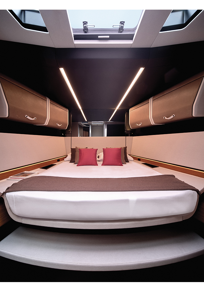 Molta flessibilità anche per quanto riguarda gli interni. La versione standard prevede un doppio salone a tutto baglio e una cabina armatore con letto queen-size e locale toilette con doccia a prua. Nella versione ‘flexi-guest’, una cabina ospiti è posizionata sul lato sinistro a mezzanave, con il salone a dritta.