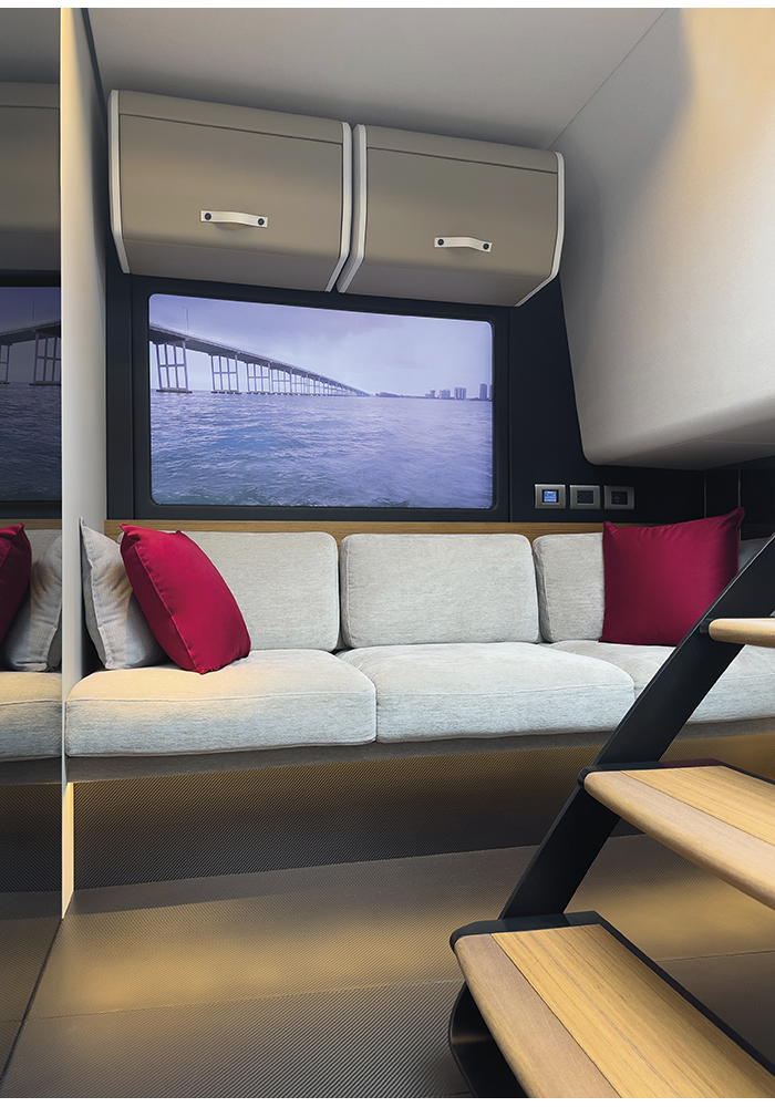 Altra novità è rappresentata dal “Magic Porthole” , un sistema che permette di riprendere attraverso le telecamere l’ambiente circostante e di proiettare le immagini su grandi schermi interni, permettendo agli ospiti di “guardare” fuori pur in assenza di finestrature realizzate sugli scafi. Soluzione che certo può non convincere tutti, ma che nelle intenzioni del cantiere punta a tutelare la privacy e a eliminare le zone di maggiore fragilità in caso di impatti.