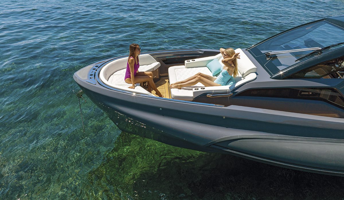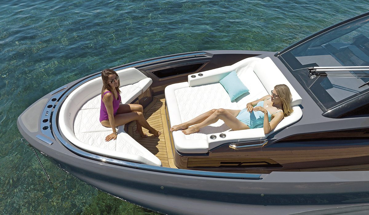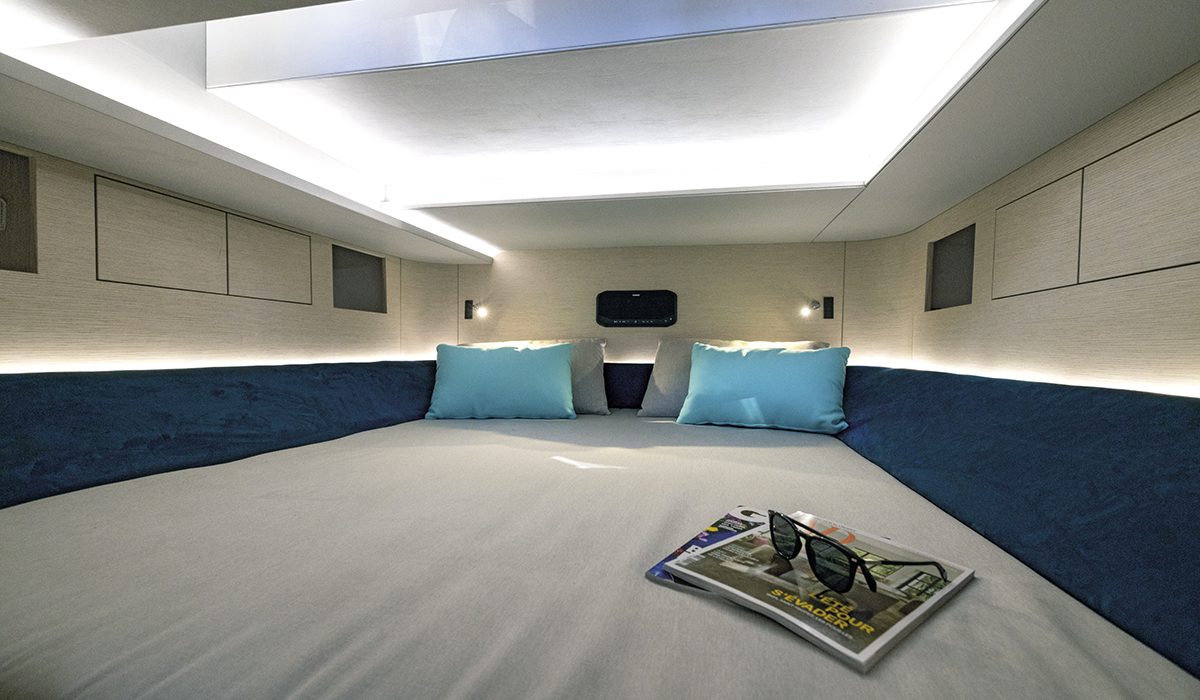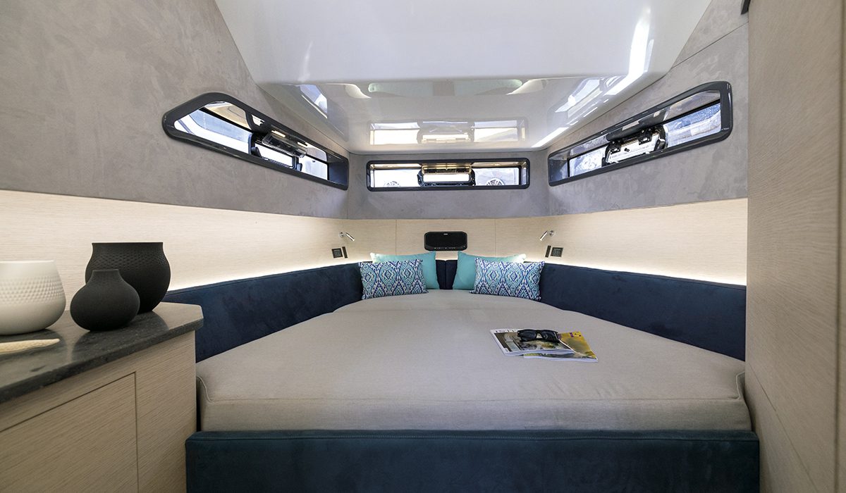 Dal punto di vista stilistico, colpisce la scelta di creare due aree speculari, due zone che si guardano composte dagli stessi elementi: un prendisole per lato all’estrema poppa, due divani contrapposti con tavolini nella zona centrale del pozzetto. In mezzo, un agevole passaggio che conduce alla plancia di comando. La postazione di pilotaggio conta su tre poltrone, alle cui spalle è inserito un mobile cucina, e su una strumentazione completa di due touchscreen da 17 pollici.