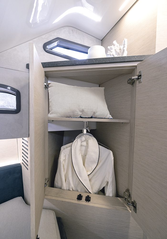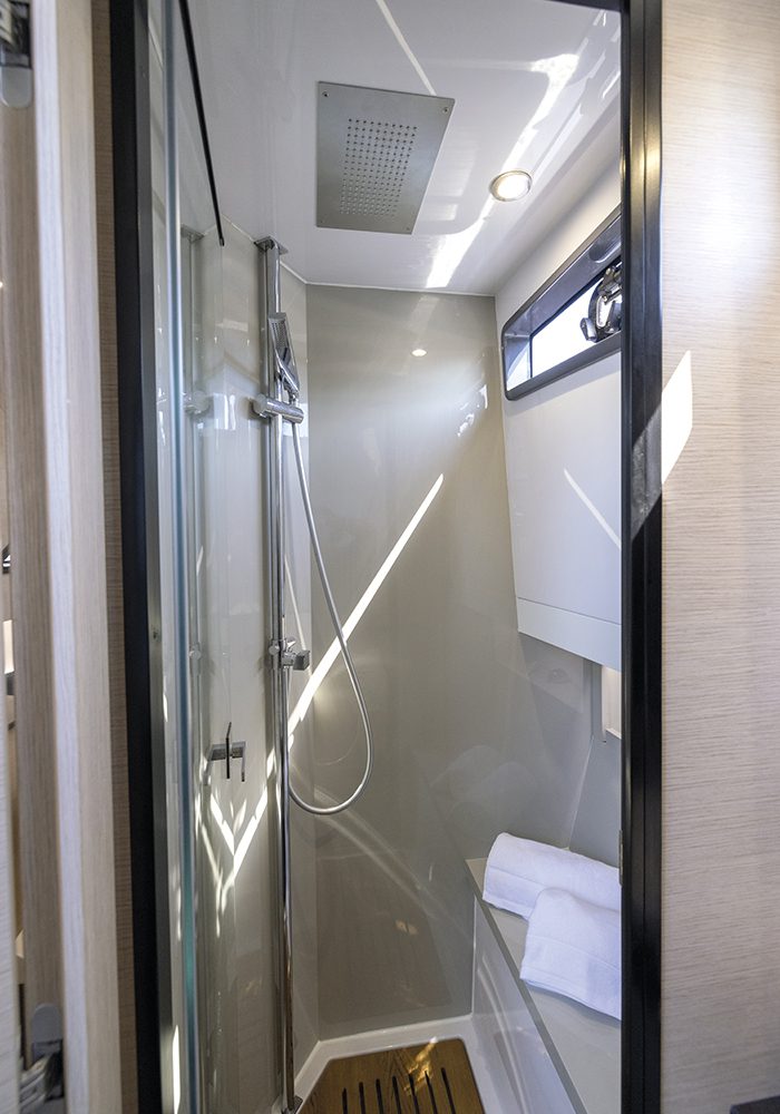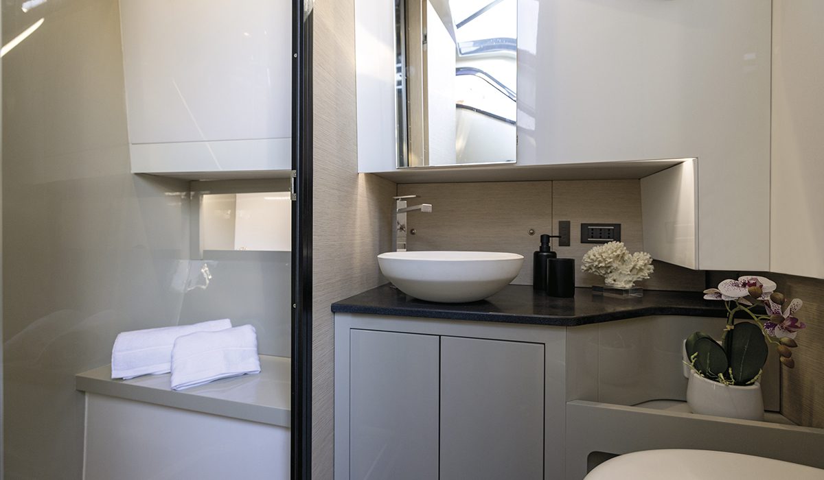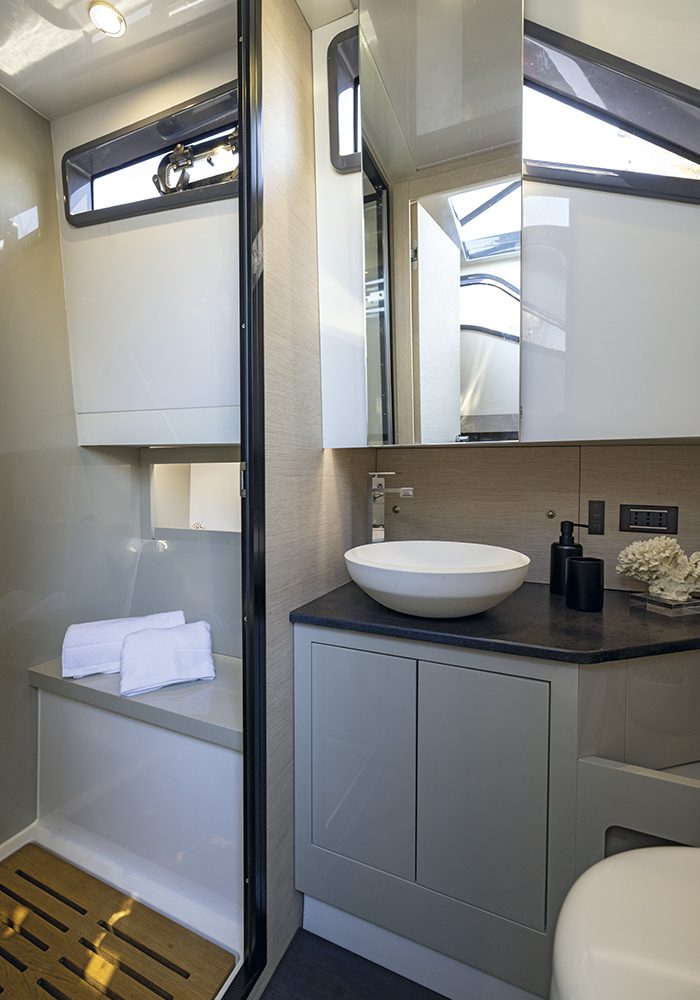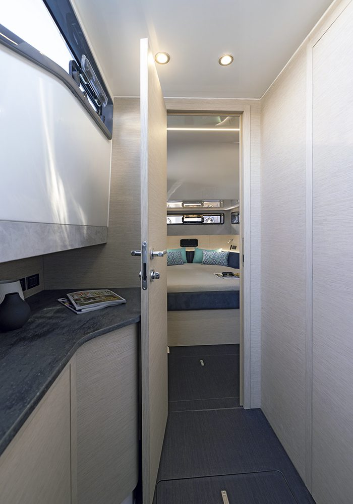 Degni di nota anche gli interni, con una cabina armatore a prua completamente “fasciata” dagli oblò, e quella doppia di poppa, che gode di una buona altezza sfruttando la zona rialzata della plancia di comando. Un bagno con box doccia separato completa la zona notte.