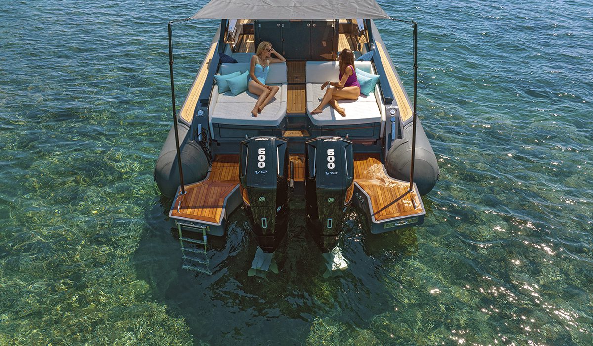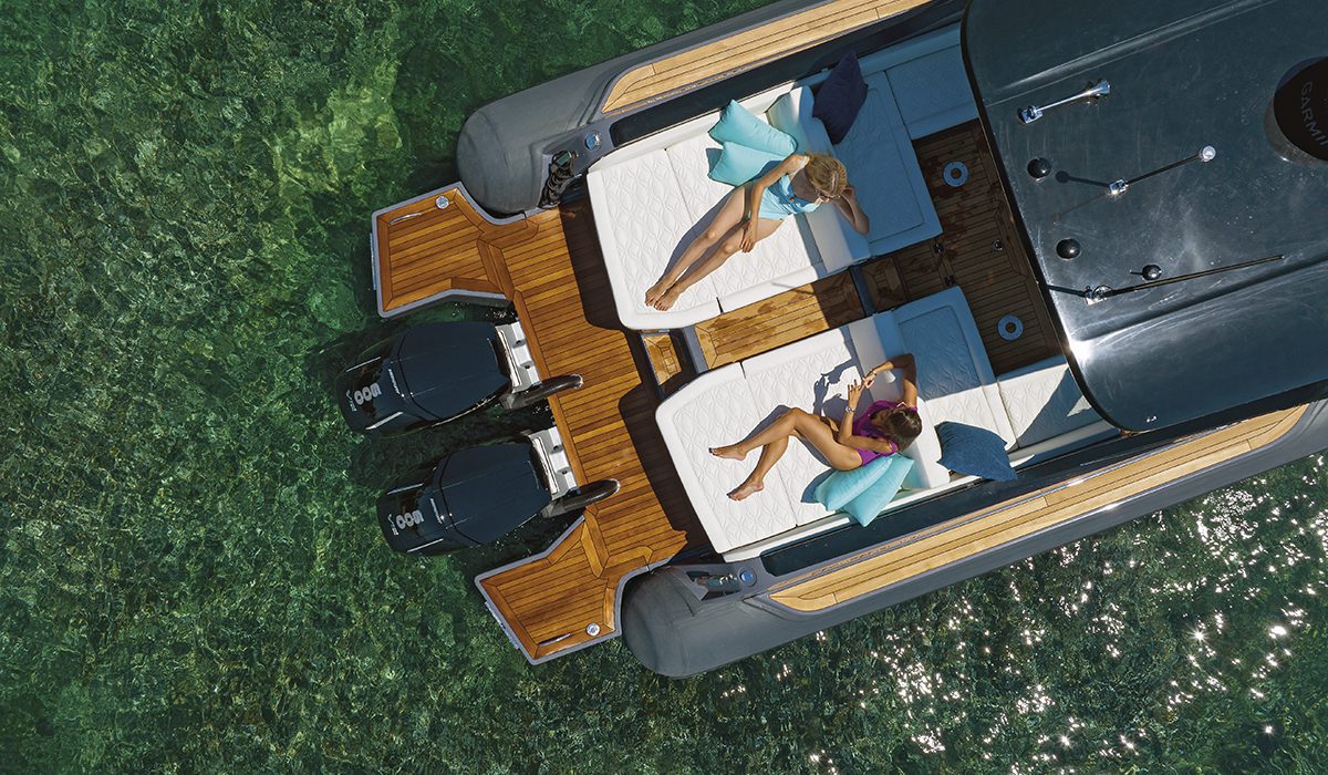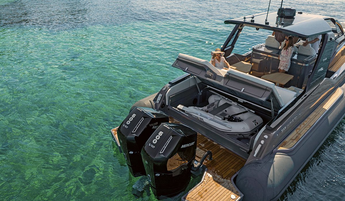 Ma è tornando all’estrema poppa che scoviamo uno degli elementi di maggiore originalità per un rib di queste dimensioni. Sotto i due prendisole è stato infatti ricavato lo spazio per un garage in grado di ospitare un tender, naturalmente uno Zar della gamma Mini.
