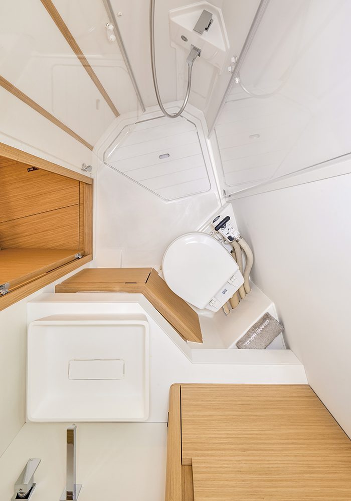 Toilette: due, una dedicata alla cabina armatoriale, una esterna alle cabine di poppa entrambe con box doccia separati.