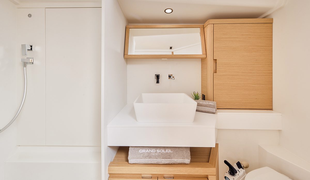 A parità di volume e di organizzazione degli spazi interni, suddivisi in tre cabine e due bagni, nel GS 44 race spariscono gli stipetti alti a murata per risparmiare sul peso che inevitabilmente si genera stivando materiale al loro interno, mentre il corian dei ripiani viene sostituito dal composito.