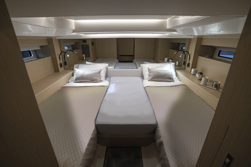 Sottocoperta, si ripropone l’organizzazione molto classica degli spazi: due cabine, un bagno e un disimpegno. La vivibilità della coperta del 37, molto simile a quella del DB43, potrebbe indurci a un raffronto non corretto se fatto fra gli spazi interni delle due barche. Quelli del 37 sono tipici di una barca di queste dimensioni, in cui la scelta di privilegiare i volumi delle cabine e del bagno va a scapito della dinette che, per l’appunto, diventa un semplice disimpegno.