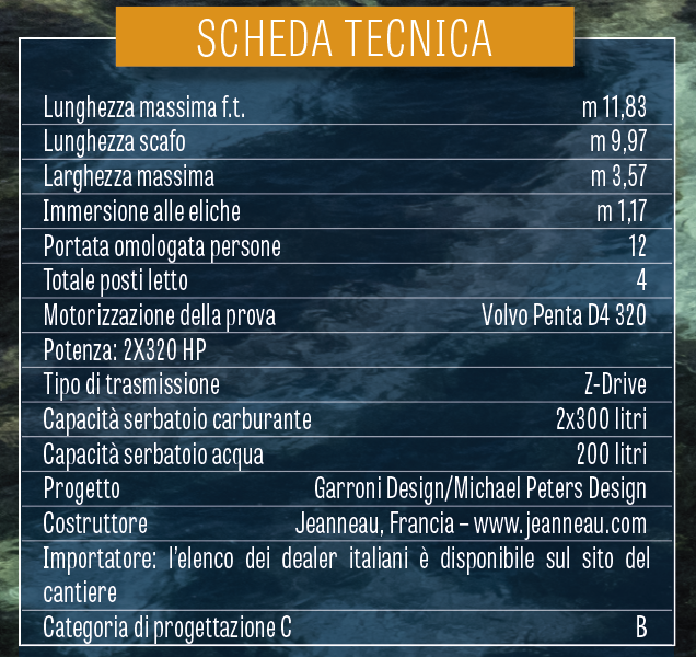 Nonostante l’assetto del DB 37 – con 6 persone a bordo e il 100{2e3577d2bd6aebaa150c85c33fcd353783f1aa6c690283591e00ef60b3336fc8} di acqua nei serbatoi – non fosse ideale per testare le prestazioni e, soprattutto, il trim fosse bloccato a -1 a scapito di assetti e velocità, spingendo le manette a fondo corsa abbiamo preso 3.550 giri raggiungendo la velocità non trascurabile di 33 nodi. Il comportamento della carena, anche questa volta disegnata da Michael Peters, storica firma per Jeanneau, è stato buono, con un passaggio sull’onda corta e ripida sempre piuttosto deciso a rompere l’acqua senza forti impatti.