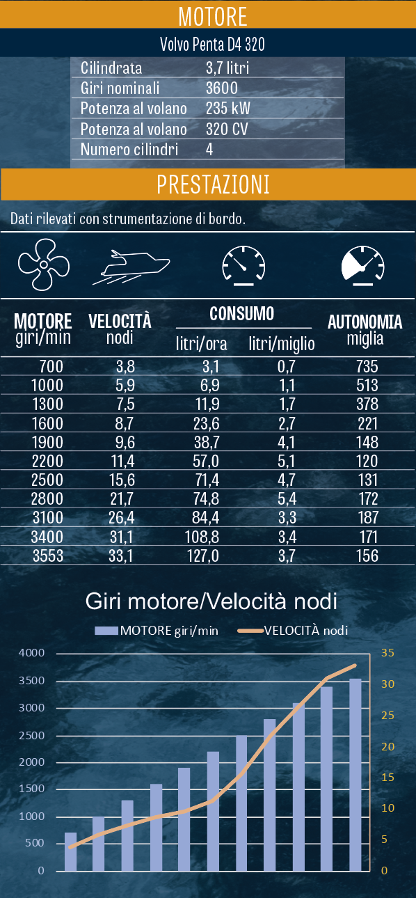 CONDIZIONI – Vento: forza 2 – Mare: 2 – Carichi liquidi: carburante 30{2e3577d2bd6aebaa150c85c33fcd353783f1aa6c690283591e00ef60b3336fc8} – Acqua 100{2e3577d2bd6aebaa150c85c33fcd353783f1aa6c690283591e00ef60b3336fc8} – Persone: 6 – Pulizia dell’opera viva: buona.