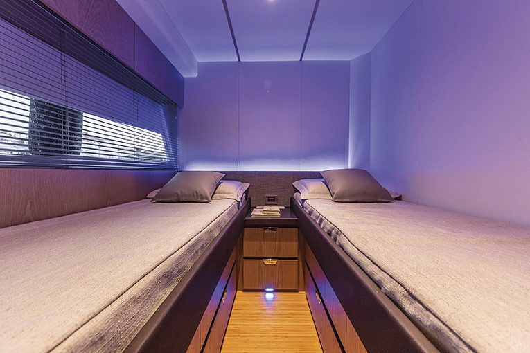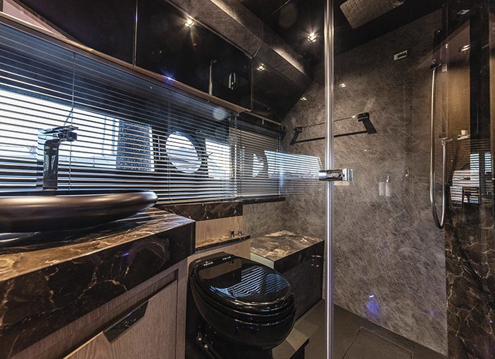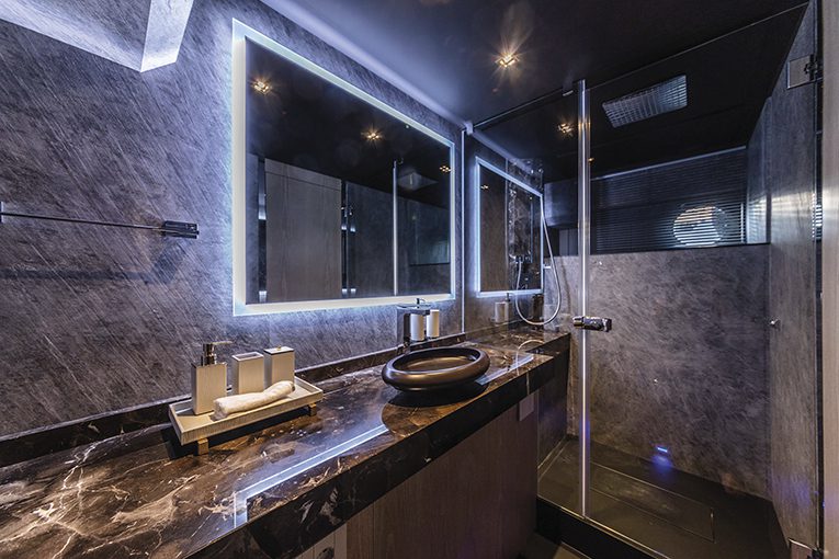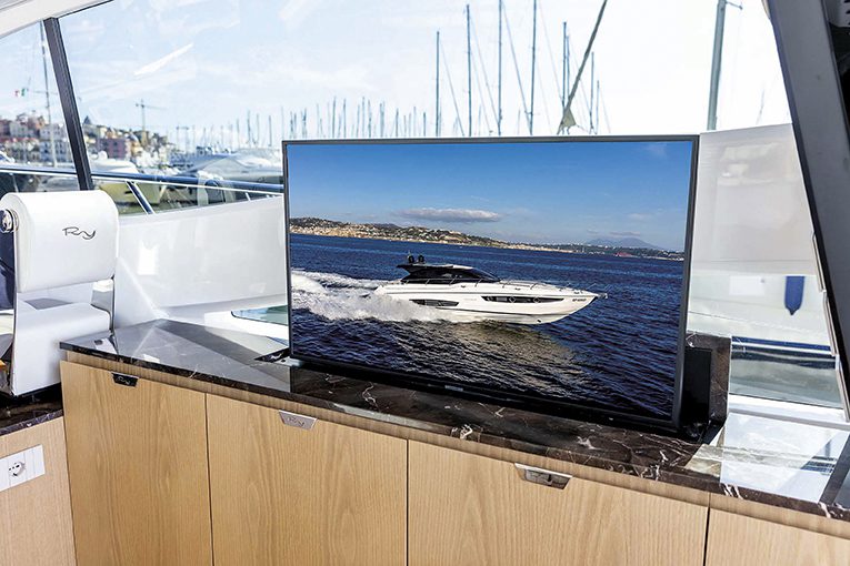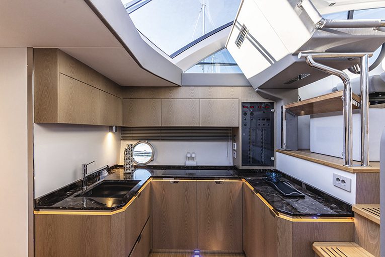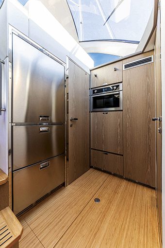- Dotazioni standard: aria condizionata, antenna satellitare, generatore da 12 kW, 2 display Garmin da 12”, passerella idraulica, pilota automatico, tender lift.