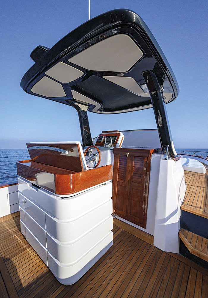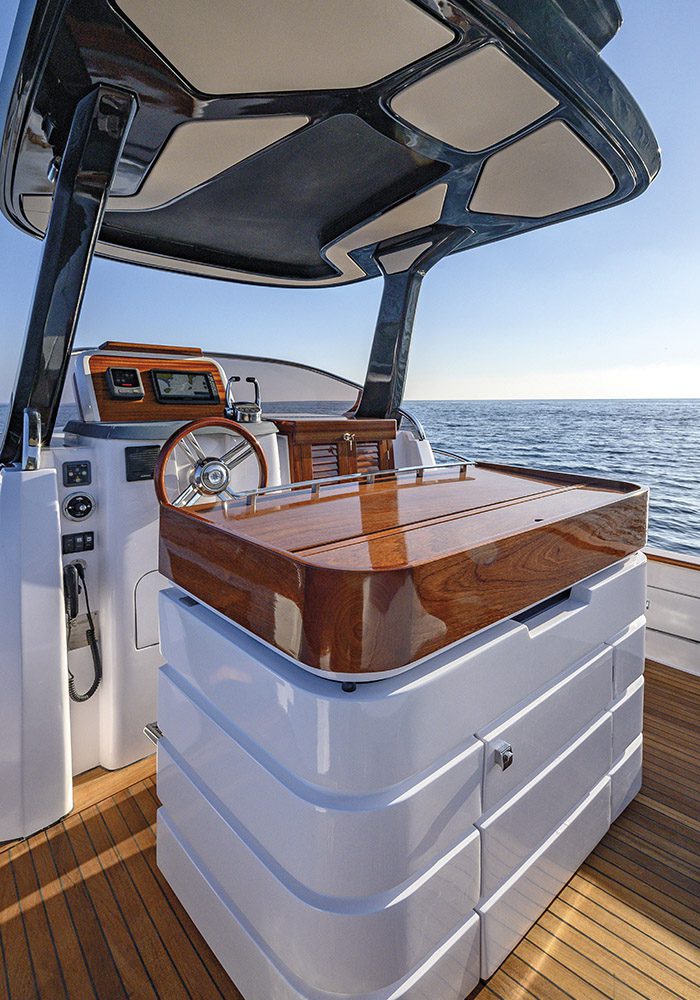 Lo scafo presenta ovviamente le caratteristiche tipiche del disegno originario ma in chiave moderna, perciò, con tutti quegli arricchimenti che erano assenti nella vecchia cara barca da pesca. Ad accogliere gli ospiti è un comodo accesso dotato di portello sulla poppa tonda, che consente un agevole passaggio tra l’ampia pedana a sbalzo e il pozzetto. Altrettanto comodo è il passaggio tra quest’ultimo e la coperta, costituito da due gradini che portano ai passavanti, protetti dalla lunga battagliola di acciaio inox che incornicia anche la prua.